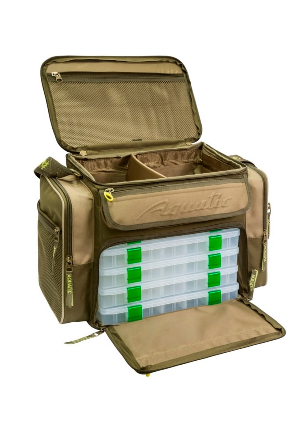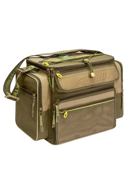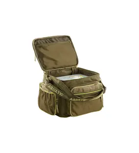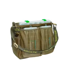 Сумка Aquatic СК-14 укомплектована 5 коробками FB-310 (306x228x39 мм) и 2 коробками FB-250 (255x188x39 мм). В верхнем отделении можно хранить катушки и другие необходимые вещи. Внутрь сумки вставлены пластиковые детали, что обеспечивает жесткость и дополнительную защиту содержимого. В эту сумку помещается столько приманок и принадлежностей, сколько не поместится в пластиковый ящик значительно большего размера. На сумке имеется светоотражающая отделка, позволяющая с помощью фонаря обнаружить сумку в темное время суток.