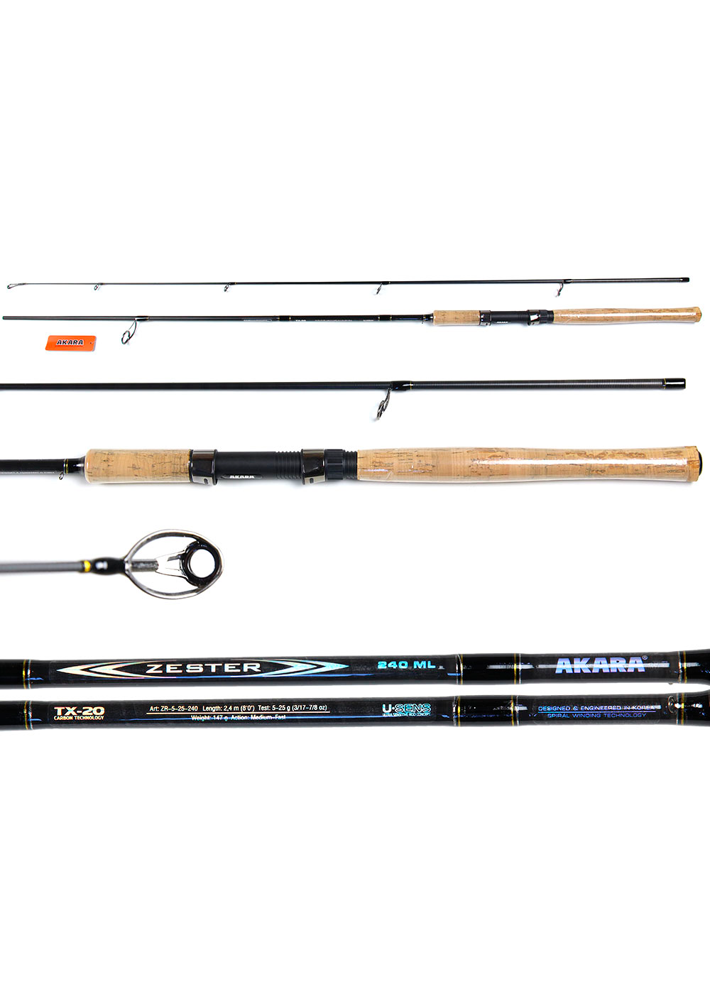 Спиннинг Akara Zester IM7 является двухколенным удилищем медленного строя и подходит для работы с приманками массой от 5 до 25 грамм. В собранном состоянии его длина составляет 2,4 метра. Бланк данного спиннинга изготовлен из композитного материала, обладающего высокой прочностью и обеспечивающего длительный срок службы удилища.