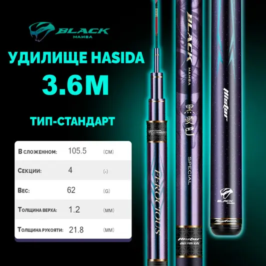 HASIDA Black Mamba - качественное маховое удилище, предназначенное для поплавочной ловли. Модель отличается оптимальным сочетанием прочности, гибкости и чувствительности, что делает ее отличным выбором как для начинающих, так и для опытных рыболовов.