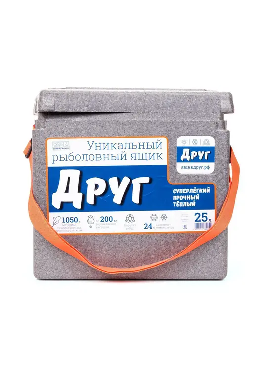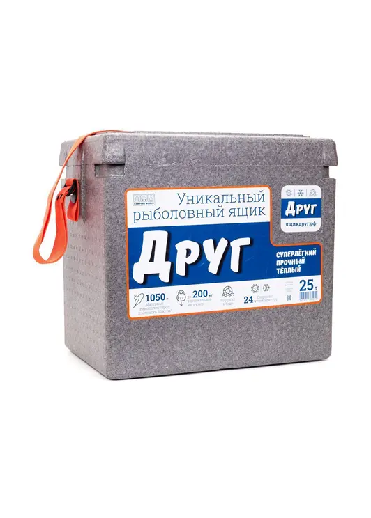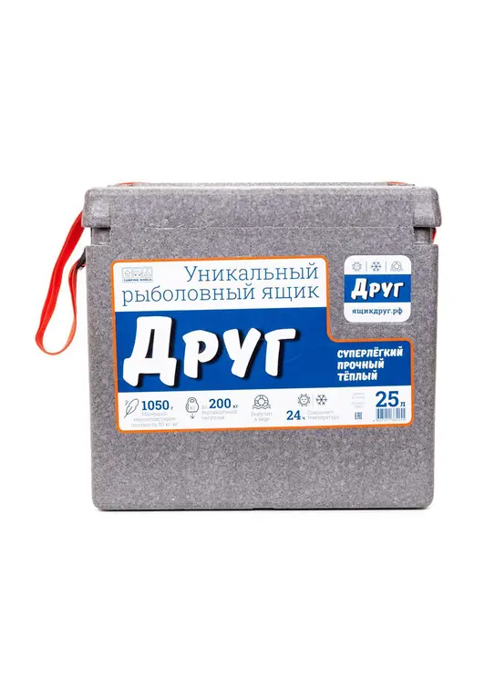 Рыболовный ящик Camping World «Друг» объёмом 25 литров выполнен в сером цвете из прочного пенополистирола. Модель отличается компактными размерами 39,5×43×29 см и небольшим весом 920 г, что делает его удобным для транспортировки. Ящик оснащён наплечным ремнём для комфортной переноски. Конструкция обеспечивает отличные теплосберегающие характеристики и способна поддерживать температуру содержимого до 24 часов. Прочный материал выдерживает вертикальную нагрузку до 170 кг. Крышка ящика может использоваться как столик, а сам ящик выполняет функции термоконтейнера и может служить спасательным средством на льду. Идеальное решение для хранения снастей, улова и транспортировки продуктов в любых погодных условиях.