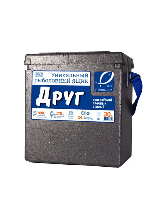Рыболовный ящик Camping World «Друг» объёмом 30 литров выполнен в сером цвете из прочного пенополистирола. Модель имеет габариты 46,5×43×29 см и весит всего 990 г, что обеспечивает удобство транспортировки. Ящик оснащён наплечным ремнём для комфортной переноски. Конструкция обладает отличными теплосберегающими характеристиками и поддерживает температуру содержимого до 24 часов. Материал выдерживает вертикальную нагрузку до 200 кг. Крышка ящика может использоваться как столик, а сам ящик выполняет функции термоконтейнера и может служить спасательным средством на льду. Благодаря своим характеристикам модель идеально подходит для хранения снастей, улова и транспортировки продуктов в любых погодных условиях.