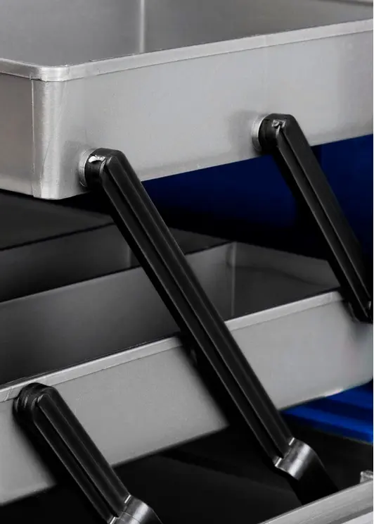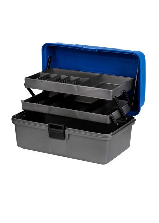 Удобный и вместительный ящик с двумя выдвижными полками для различной рыболовной оснастки: поплавков, приманок и другой полезной мелочи. На дно ящика можно положить 1-3 спиннинговых катушек. Материал: ударопрочный полипропилен.