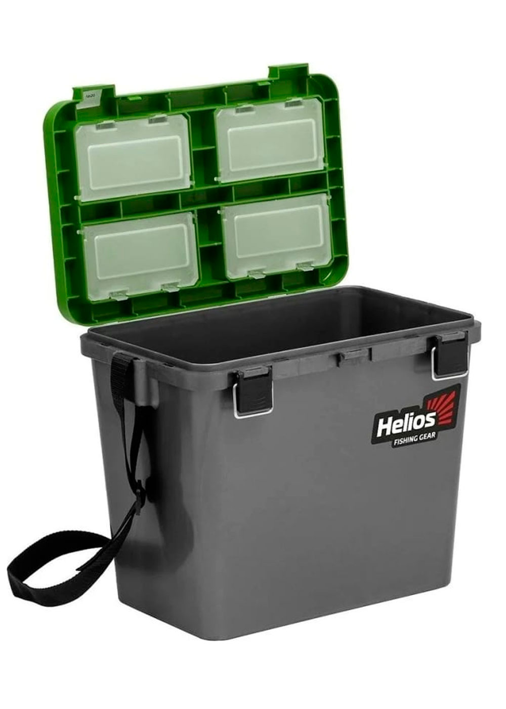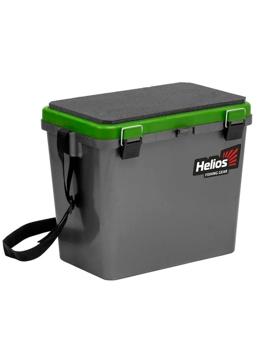 Ящик рыболовный зимний односекционный серого и салатового цветов от производителя Helios изготовлен из ударопрочного, морозостойкого и лёгкого пластика. Он предназначен для надёжного хранения и транспортировки рыболовных снастей. Объём ящика составляет 19 литров, что позволяет вместить множество полезных снастей для рыбалки. Основной отсек предназначен для переноски рыболовных снастей, термоса и улова. На внутренней стороне крышки размещены четыре отделения с полупрозрачными крышками для хранения мелких аксессуаров. Замки ящика надёжны и прочны, что предотвращает самопроизвольное открытие. Удобный наплечный ремень обеспечивает комфортную транспортировку. Пластиковый каркас ящика выдерживает низкие температуры до −40 °C и не пропускает воду. Мягкое незамерзающее сиденье на крышке ящика обеспечивает комфортное времяпрепровождение на рыбалке в течение длительного времени. Дно ящика оснащено специальными насечками против скольжения по льду.