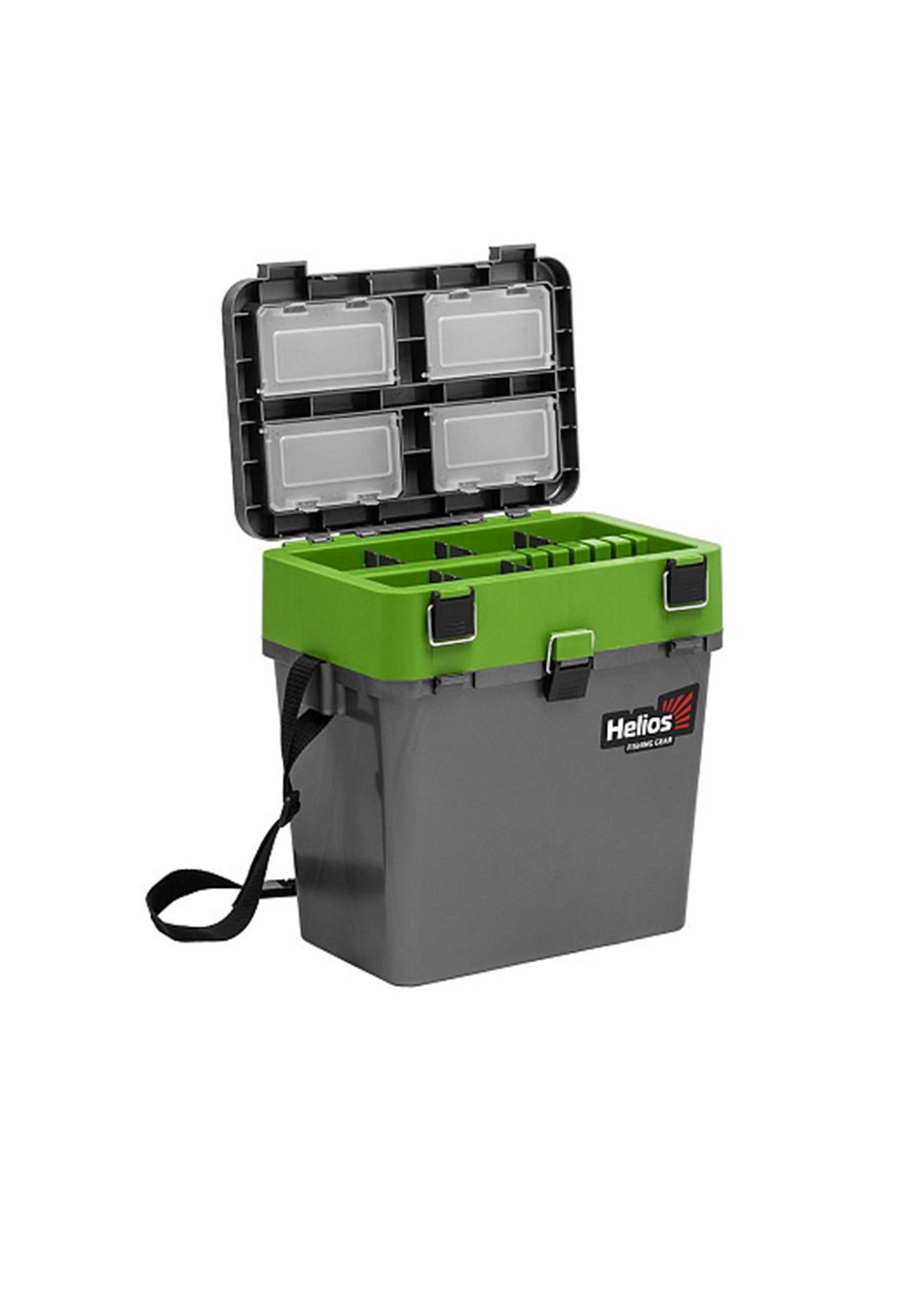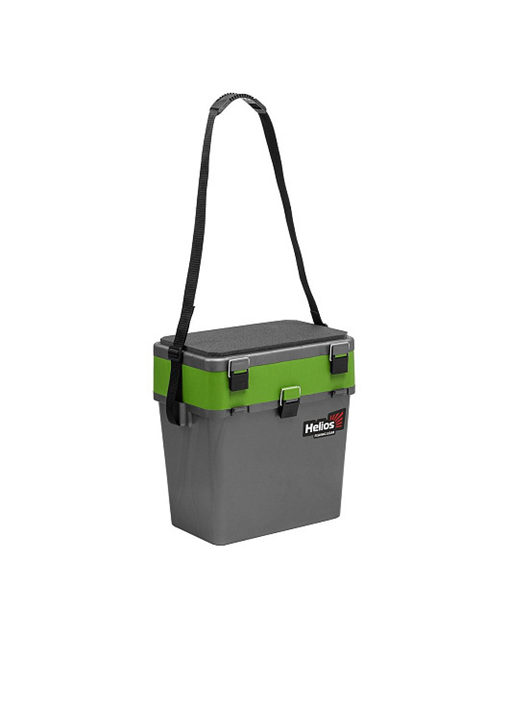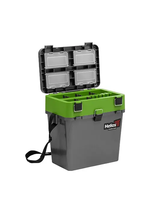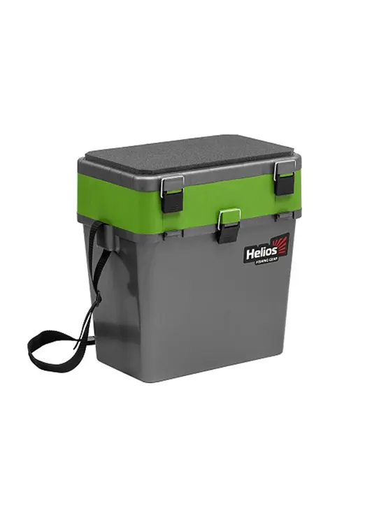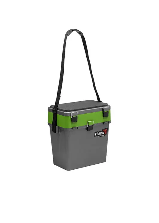 Зимний рыболовный ящик Helios HS-IB-19-GG в серо-салатовом цвете выполнен из ударопрочного морозостойкого пластика, выдерживающего температуру до -40°C, имеет объём 19 литров и размеры 39×26×40 см. Конструкция включает основной отсек со съёмными перегородками для удочек, внутреннюю сторону крышки с отделениями для мелких аксессуаров, надёжные замки и наплечный ремень. Ящик оснащён мягким незамерзающим сиденьем на крышке, специальными противоскользящими насечками на дне, обладает влагостойкостью и непроницаемостью, выдерживает нагрузку до 210 кг, весит 2 кг и подходит для зимней и летней рыбалки.