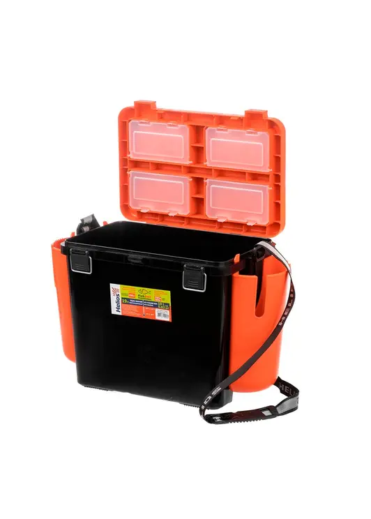 Зимний односекционный ящик FishBox оранжевого цвета от производителя Helios имеет объём 19 литров. Он изготовлен из морозоустойчивого и ударопрочного пластика, который не впитывает и не пропускает воду. Размеры ящика составляют 500 мм (длина с учётом навесных карманов), 380 мм (длина без навесных карманов), 320 мм (высота) и 255 мм (ширина). Нагрузка на ящик составляет 130 кг. В комплект входят регулируемый по длине плечевой ремень с прорезиненной вставкой, удобные застёжки и мягкое сиденье из пенополиуретана на крышке.