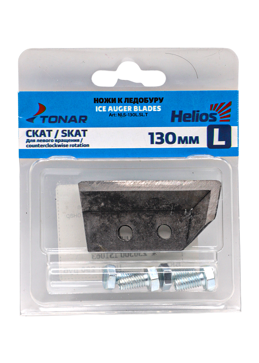 Ножи Тонар ЛР-130L СКАТ с левым вращением (NLS-130L.SL.T) подходят для всех ледобуров производства ТОНАР с левым вращением. Они изготовлены из высокоуглеродной легированной стали и имеют твёрдость 55–60 HRC после закалки. Диаметр бурения составляет 130 мм.