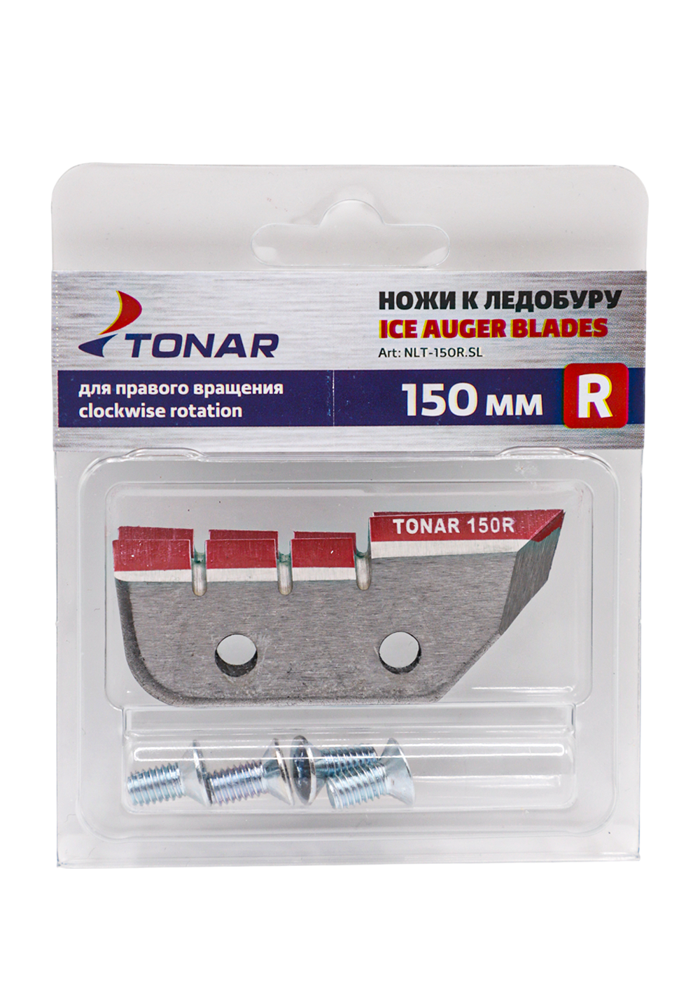 Ножи Тонар ЛР-150R с правым вращением предназначены для ледобуров и шнеков с плоскими площадками рабочей части. Они имеют оптимальные углы резания и изготовлены из высокоуглеродистой легированной стали. После закалки их твёрдость составляет 57–62 HRC, что позволяет многократно перетачивать ножи без ухудшения их первоначальных свойств.