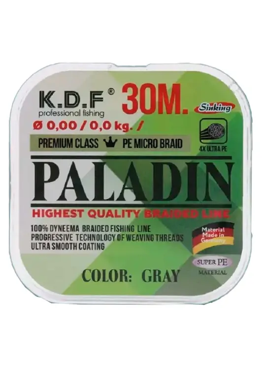 Kaida KDF Paladin,плетеные шнуры с трехслойной пропиткой которая обеспечивает высокую износосотойкость и применение в отрицательную погоду. Шнур быстро погружается, у него очень низкая растяжимость, большая чувствительность к поклевке. Шнур - 4-жильный, плотное плетение делает ее поверхность более ровной и гладкой, что положительно сказывается на качестве заброса. Серия Paladin считается универсальной: шнуры можно использовать как в спиннинговой ловле, так и в фидерной. Плетеный шнур Kaida Paladin серого цвета, размотка - 30 метров.