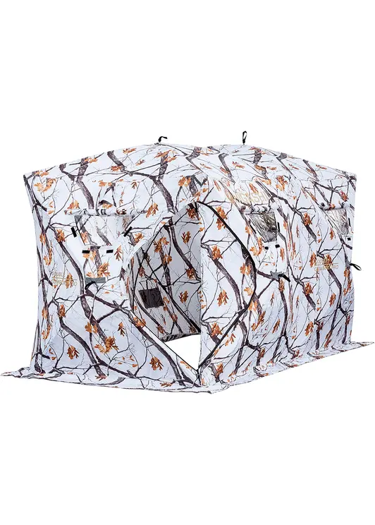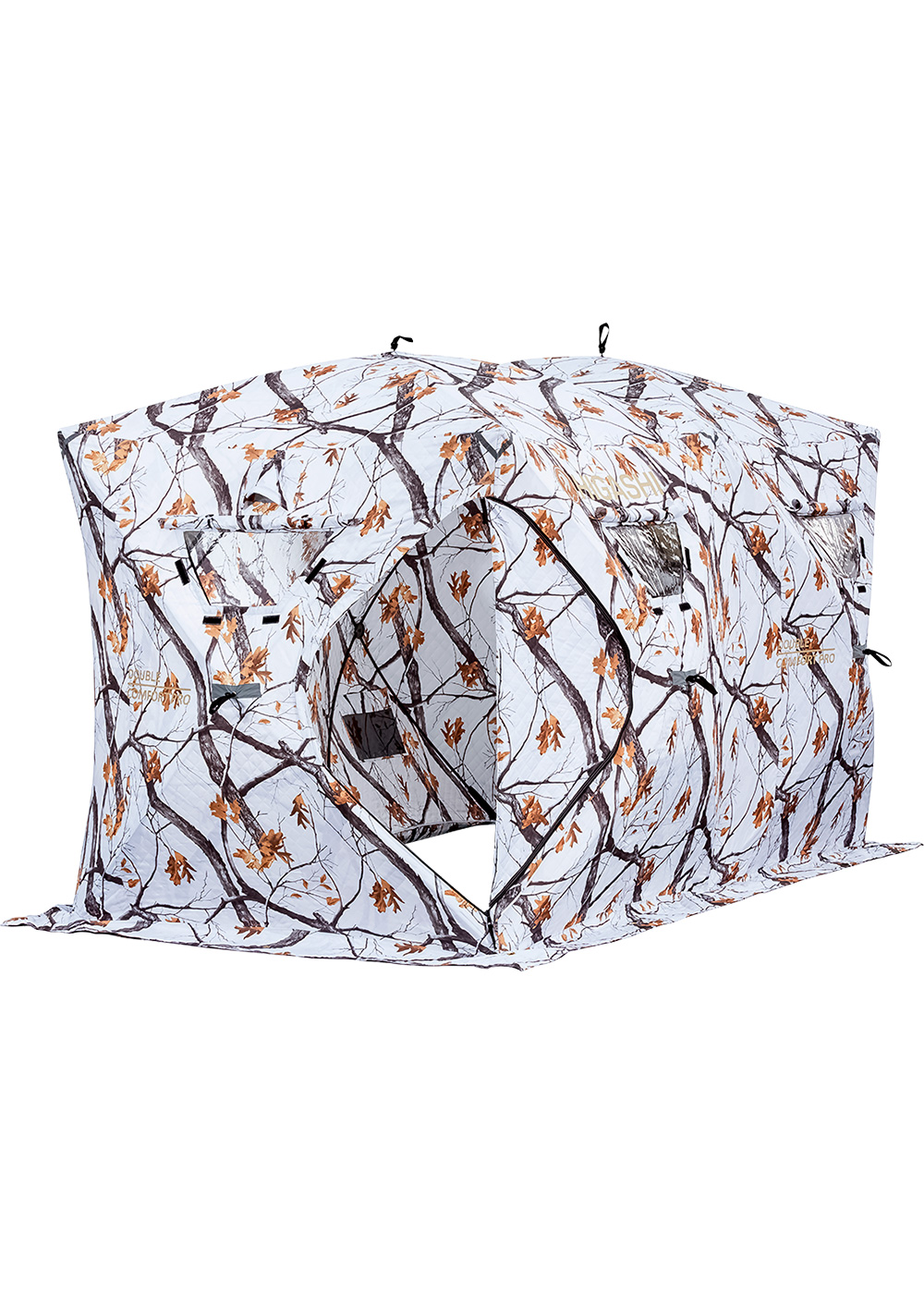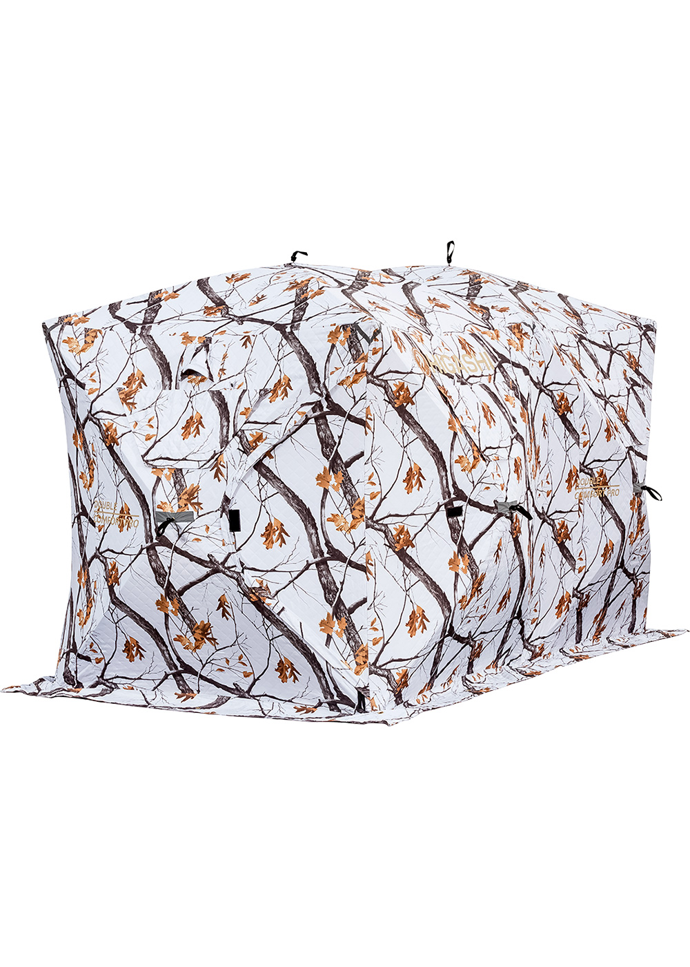 Зимняя палатка Higashi Double Comfort вмещает до 4–6 человек. Она подойдет для большой компании или для размещения спальных мест и снаряжения для рыболовов, практикующих многодневные выезды на водоем. Палатку можно модернизировать и с помощью врезки под дымоход установить печь. Вентиляционные отверстия обеспечивают приток свежего воздуха. Окна в количестве шести штук наполняют внутреннее пространство светом, поэтому в пасмурный день не придется использовать дополнительные источники освещения. При необходимости окна можно закрыть, опустив клапана и зафиксировав их липучками. Для хранения вещей, которые должны быть под рукой, на стенках имеются карманы. Палатка быстро устанавливается. Каркас состоит из дуг и хабов, отличающихся высокой надежностью. Чтобы конструкцию не унесло ветром, в комплект входят ввертыши. Плотная ткань (Nylon 300D) не пропускает воду, а так как все швы проклеены, тающий снег не проникает внутрь палатки. Зайти в нее можно с двух сторон. Это сделано для того, чтобы рыбаки не мешали друг другу. Ветрозащитная юбка и планки, прикрывающие молнии на входах, не дают холоду проникать под тент.