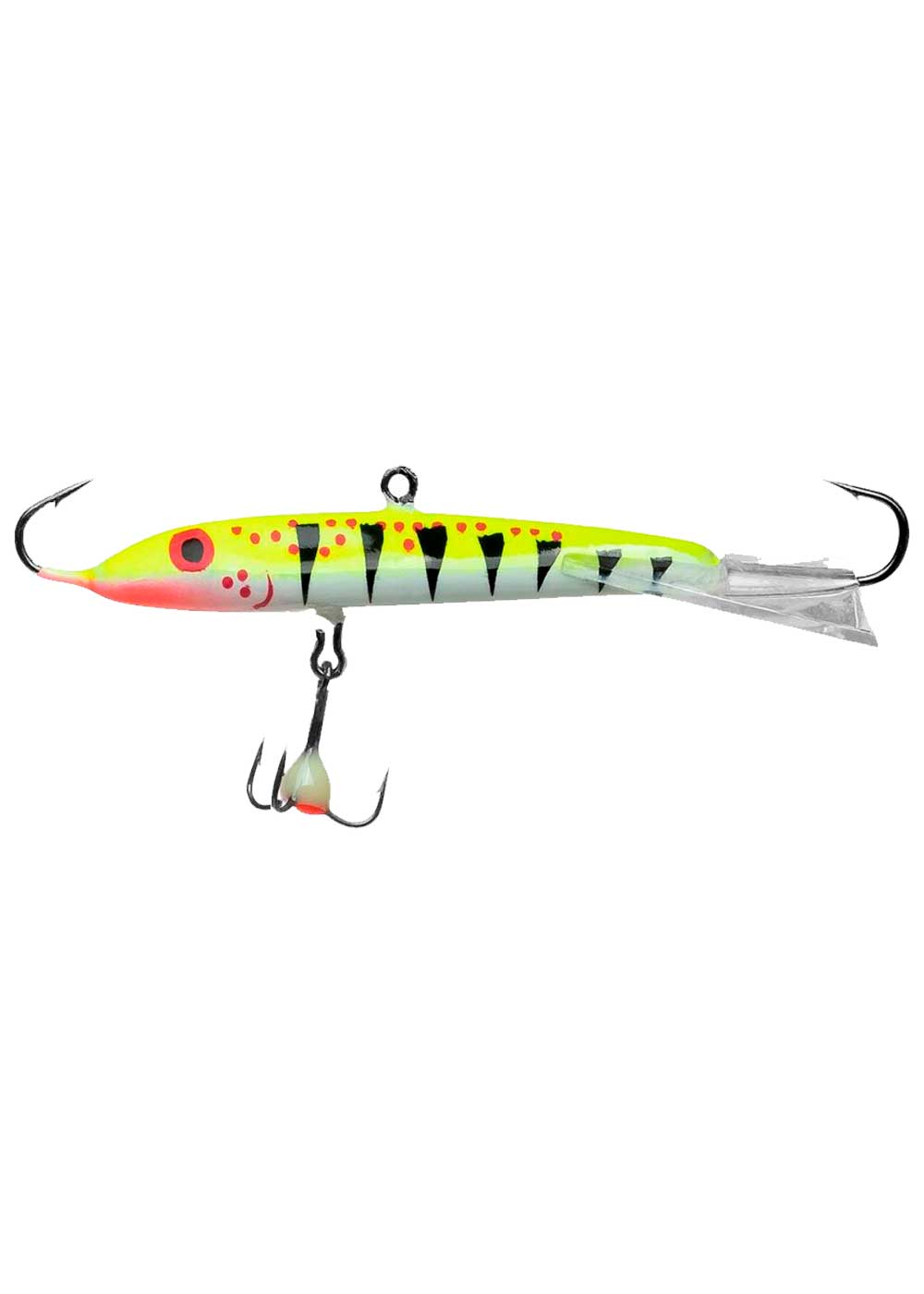 Балансир №10 - приманка для рыбной ловли в зимнее время. Выглядит как небольшая рыбка желтого цвета с белым брюшком и черными полосками по бокам. На приманку охотно клюют окунь, щука, судак и другие хищные рыбы.