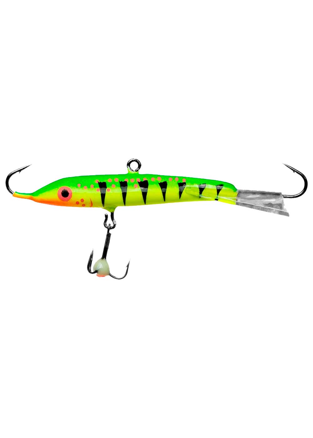 Балансир №8 - приманка для рыбной ловли в зимнее время. Выглядит как небольшая рыбка желтого цвета с зеленоватой спинкой и черными полосками по бокам. На приманку охотно клюют окунь, щука, судак и другие хищные рыбы. В голове и хвосте балансира впаяны одинарные крючки. Снизу на кольце крепится крючок-тройник, на который обычно и зацепляется клюнувшая рыба. На хвосте имеется стабилизатор из пластика. При движениях вверх-вниз приманка уходит то в одну, то в другую сторону, тем самым привлекая внимание хищной рыбы. Балансир покрыт специальной стойкой краской.