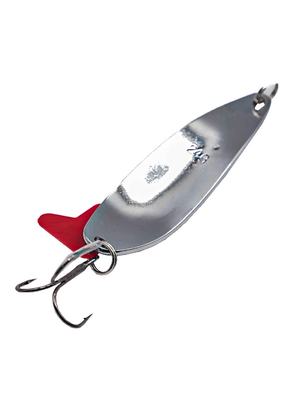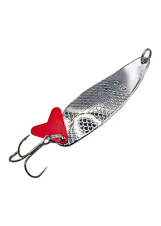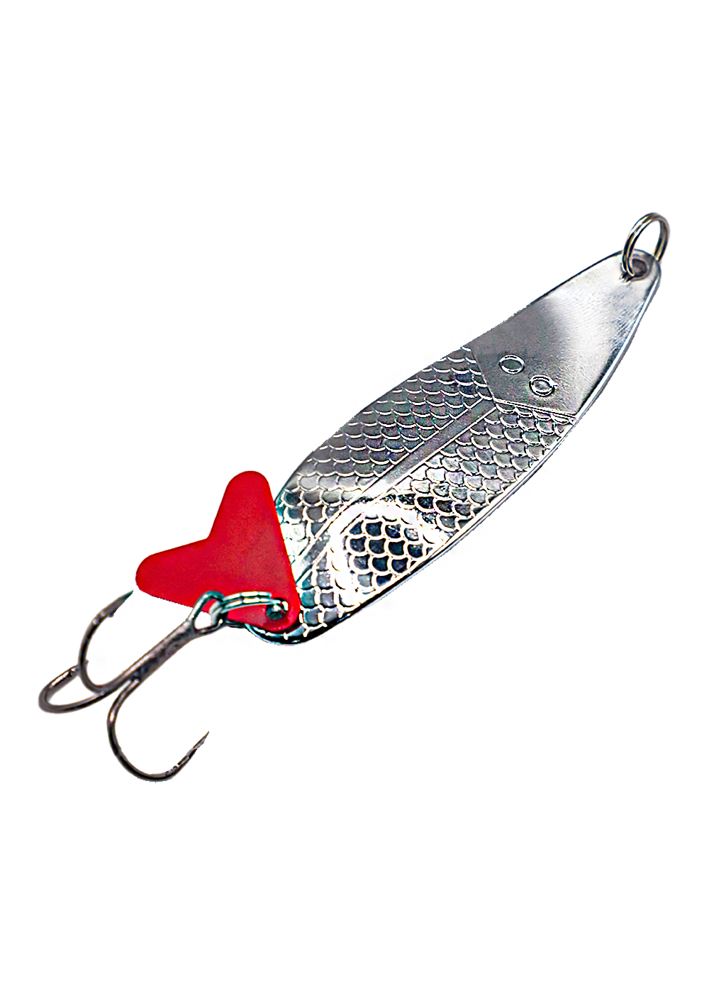 Блесна имеет современную форму с особым рельефом поверхности, создающим привлекательные световые эффекты в воде. Корпус выполнен из прочного металла с качественным покрытием, устойчивым к механическим повреждениям. Оснащена надёжным тройным крючком с дополнительным силиконовым элементом для усиления привлекательности приманки.