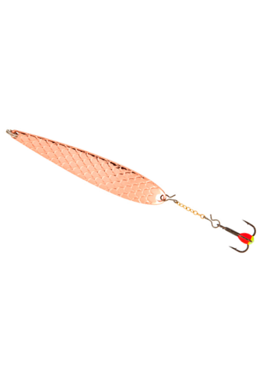 Глубины применения от 0,5 метра. Насечки в виде чешуи на блесне дополнительно привлекают внимание хищника. Рыба: окунь от мелкого до среднего, не крупная щука. Комплектуется цепочкой с тройником и яркой бусинкой. Выпускается в трех размерах и в трех расцветках: медь, серебро, золото.