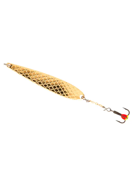 Глубины применения от 0,5 метра. Насечки в виде чешуи на блесне дополнительно привлекают внимание хищника. Рыба: окунь от мелкого до среднего, не крупная щука. Комплектуется цепочкой с тройником и яркой бусинкой. Выпускается в трех размерах и в трех расцветках: медь, серебро, золото.