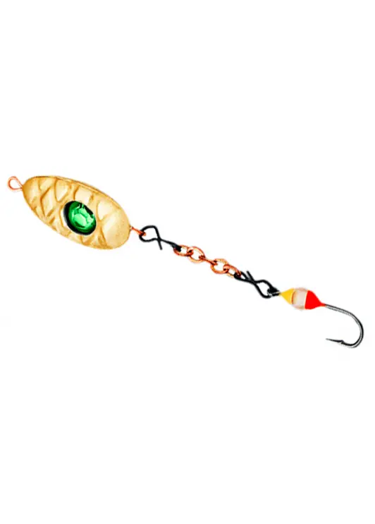 Sprut Beetle 1 - это серия небольших блесенок для зимней ловли. Все "жуки" имеют корпус длиной всего 1,5 см. Есть три варианта окраски: медь, латунь и никель. На внешней стороне блесны есть рифление и инкрустирован крупный зеленый "камень". Он дополнительно поддразнивает потенциальную добычу. "Изюминка" миниатюрных колебалок в том, что одинарник крепится к корпусу с помощью цепочки. На ее краях - застежки. При необходимости ее можно снять или заменить крючок. Оригинальный одинарник у блесен Sprut Beetle на цевье имеет разноцветный объемный декоративный элемент. Форма его чем-то напоминает икринку - любимое лакомство в зимний период многих хищных и даже мирных видов.