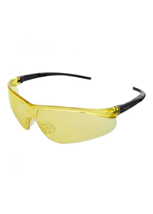 Очки c жёлтыми ударопрочными поликарбонатными линзами светопропускаемостью 89%. Обеспечивают защиту глаз спереди и сбоку от частиц, летящих со скоростью 400 м/с. Нанесена защита от царапин, Пластиковая раскрываемая упаковка (Блистер).