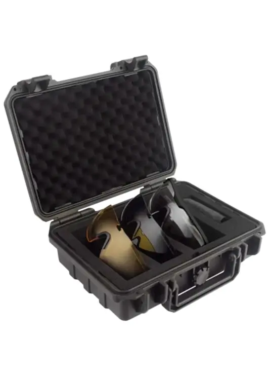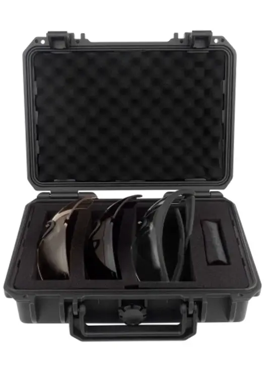 Очки с 3 сменными линзами светопропускаемостью (прозрачные 96%, желтые 89%, серые 23%). Обеспечивают защиту глаз спереди и сбоку от частиц, летящих со скоростью 400м/с. Съемная линза. Нанесена защита от царапин, ANTI-FOG покрытие. В комплекте: Кейс пластиковый большой для очков PMX-CASE GLASS KIT XL, 3 чехла на шнурке (микрофибра), регулируемый шнурок. Вес набора 705гр. Вес очков 36гр..