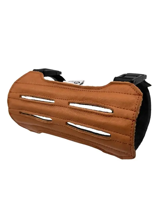 Крага изготовлена из натуральной высококачественной кожи. Внутренняя поверхность краги мягкая, что позволяет комфортно носить крагу на голой руке. Предусмотрены отверстия для вентиляции для ношения в помещениях и на улице в теплое время года. Крага дополнительно армирована гибкими пластиковыми ребрами жесткости, предотвращающими удар тетивой лука во время выстрела. Подходит для любого размера руки.