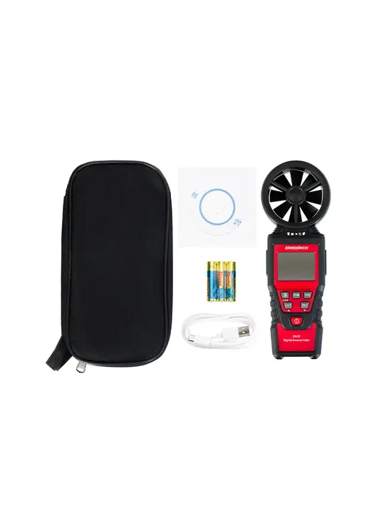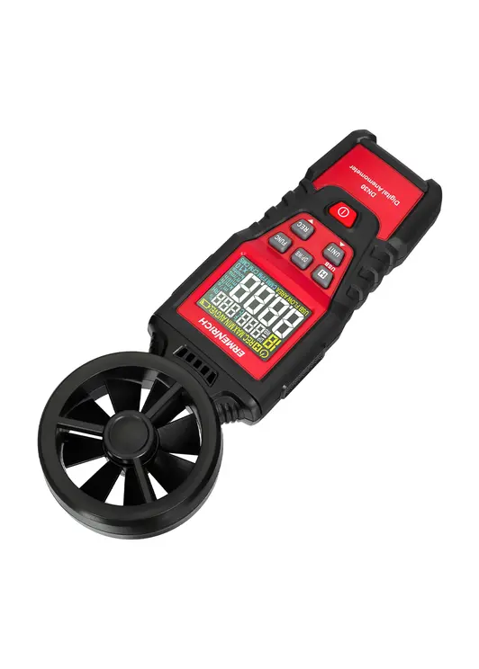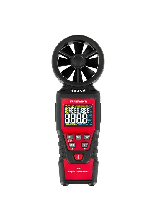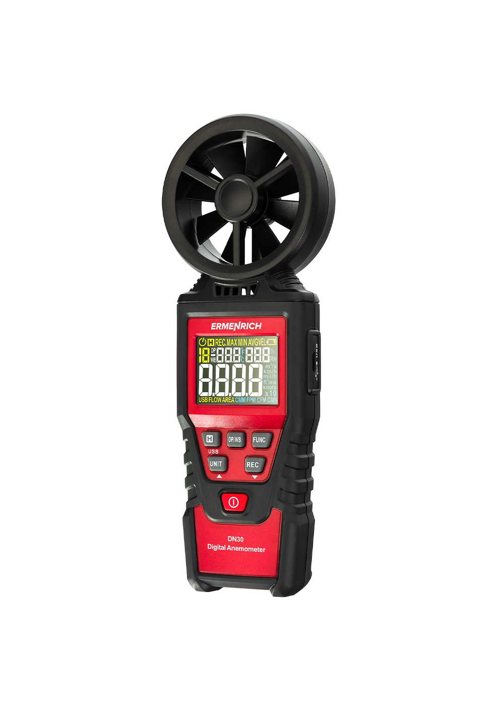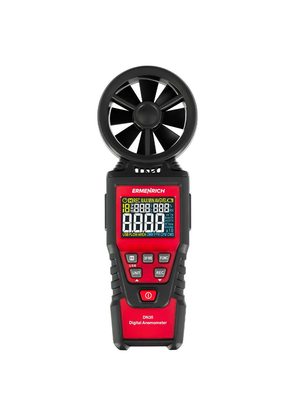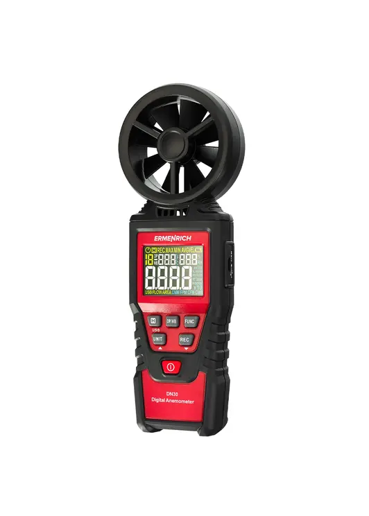 Цифровой анемометр Ermenrich Seek DN30, помимо максимально точного измерения скорости воздушного потока, поможет узнать влажность и температуру воздуха. Это легкий и компактный прибор подойдет для работы на открытой местности и в помещениях. Проводить замеры с анемометром легко, показания тут же отображаются на дисплее устройства. У экрана есть подсветка, это упрощает работу при плохом освещении.