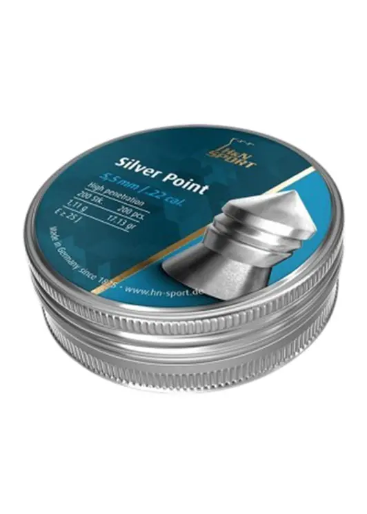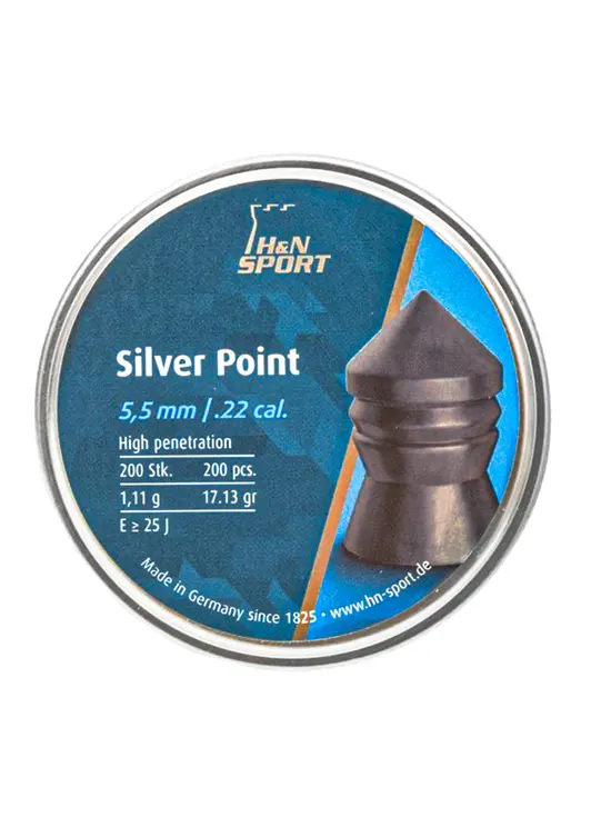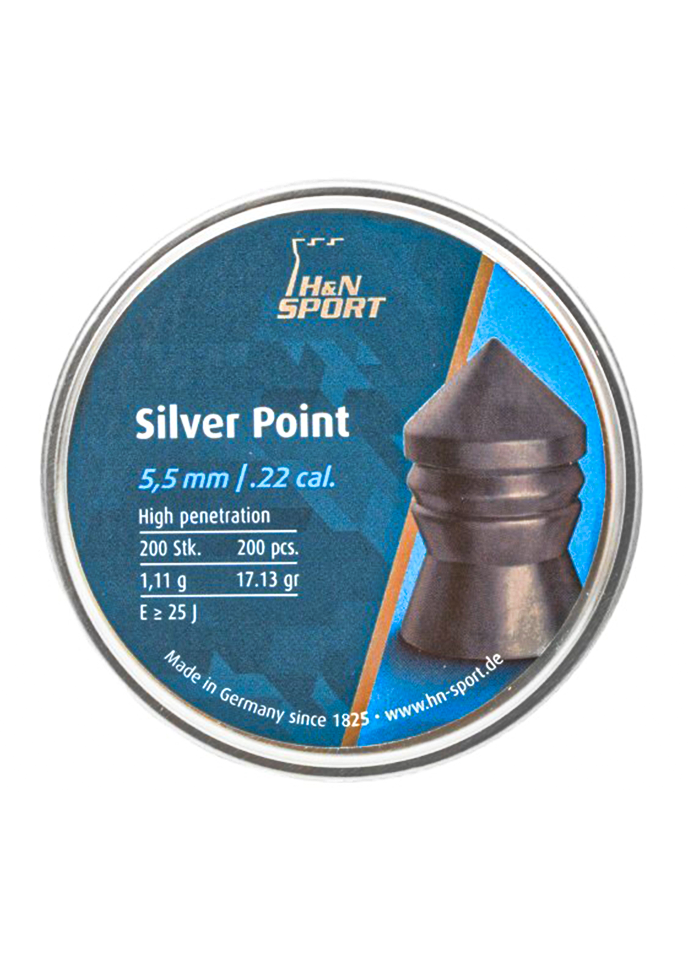 Пули H&N Silver Point калибра 5,5 мм весом 1,11 г в упаковке 200 штук — тяжёлые охотничьи боеприпасы с конической головной частью от немецкого производителя. Пули предназначены для стрельбы на средних дистанциях, отличаются высокой пробиваемостью и отличной проникающей способностью. Гладкая поверхность с канавками обеспечивает стабильное полётное поведение и минимальное сопротивление воздуха. Пули демонстрируют максимальное шоковое воздействие при попадании, подходят для спортивной стрельбы и охоты. Длина пули составляет 8,4 мм, материал изготовления — качественный свинец, гарантирующий минимальный уровень освинцовки ствола.