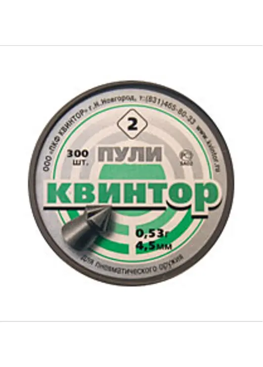 Пули для пневматического оружия Quintor, острая форма головки, калибр 4,5 мм, упаковка 300 штук (всего 100 упаковок), изготовлены из свинца. Отличаются высокой точностью и стабильной траекторией полета. Подходят для пневматических пистолетов и винтовок.