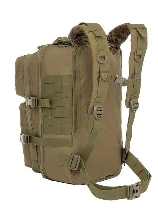 Тактический рюкзак объёмом 25 литров изготовлен из плотного полиэстера. Внутренние карманы отделаны винилом для защиты от влаги. Ламинированный полиэстер с прорезанными лазером отверстиями для установки дополнительных подсумков вместо традиционных пришитых лямок. На задней стороне мягкая подкладка, покрытая дышащей сеткой, обеспечивающая высокий комфорт использования. Ниже находится закрывающееся на липучке отделение для гидратора. Удобные регулируемые подтяжки имеют вертикальные крепежные ремни и одно D-образное кольцо для крепления дополнительного оборудования. В рюкзаке два больших основных кармана. Первый имеет большое сетчатое отделение и карман на молнии для мелких вещей. Во втором — дополнительные отделения для документов и т. д. На переднем отделении нашиты два кармана, нижний из которых снабжён дополнительными отделениями. Все карманы застёгиваются на прочные двусторонние молнии с толстыми зубцами и ручками для удобного использования в перчатках. По бокам и внизу рюкзака есть компрессионные ремни с композитными пряжками для удобства упаковки.