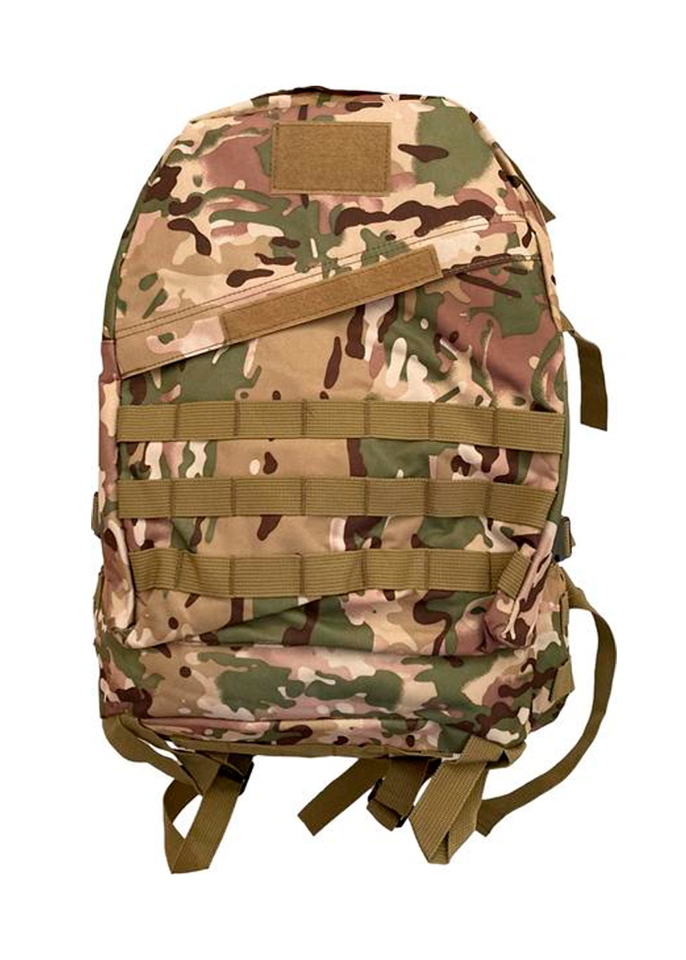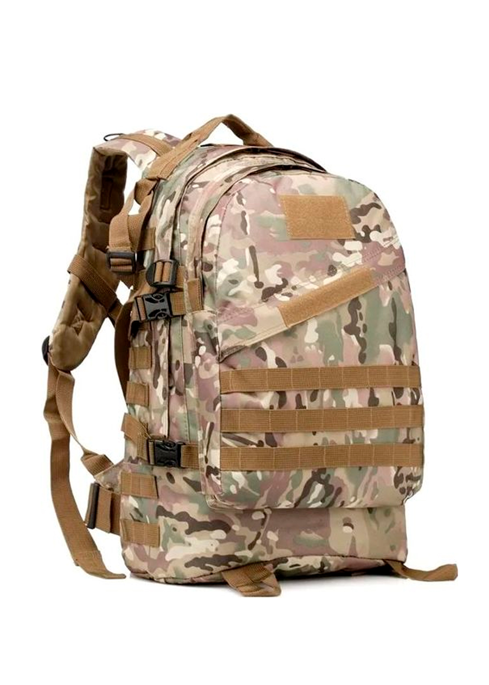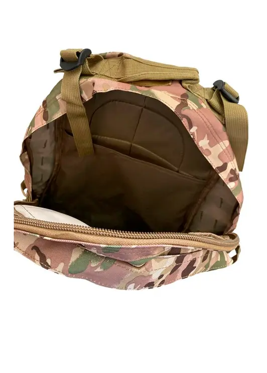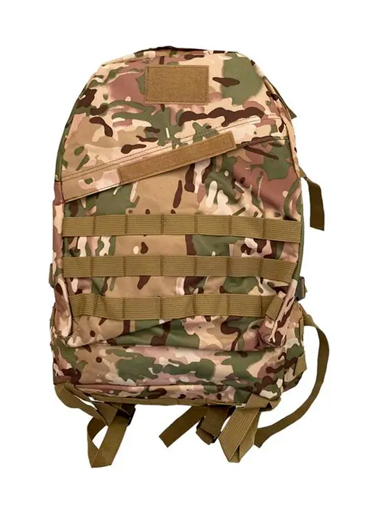 Тактический рюкзак с богатым оснащением: два больших отделения, внутренний карман и внешний плоский. Ленты Molle расположены по бокам и спереди. Регулируемые поясной и нагрудный ремни. Ручка сверху для переноски. Высококачественная водонепроницаемая ткань Оксфорд плотностью 600/900D. D-кольцо для крепления аксессуаров. Регулируемые и нескользящие мягкие лямки. Лента с крючком и петлей и патчи для флажков. Внешние боковые компрессионные ремни.