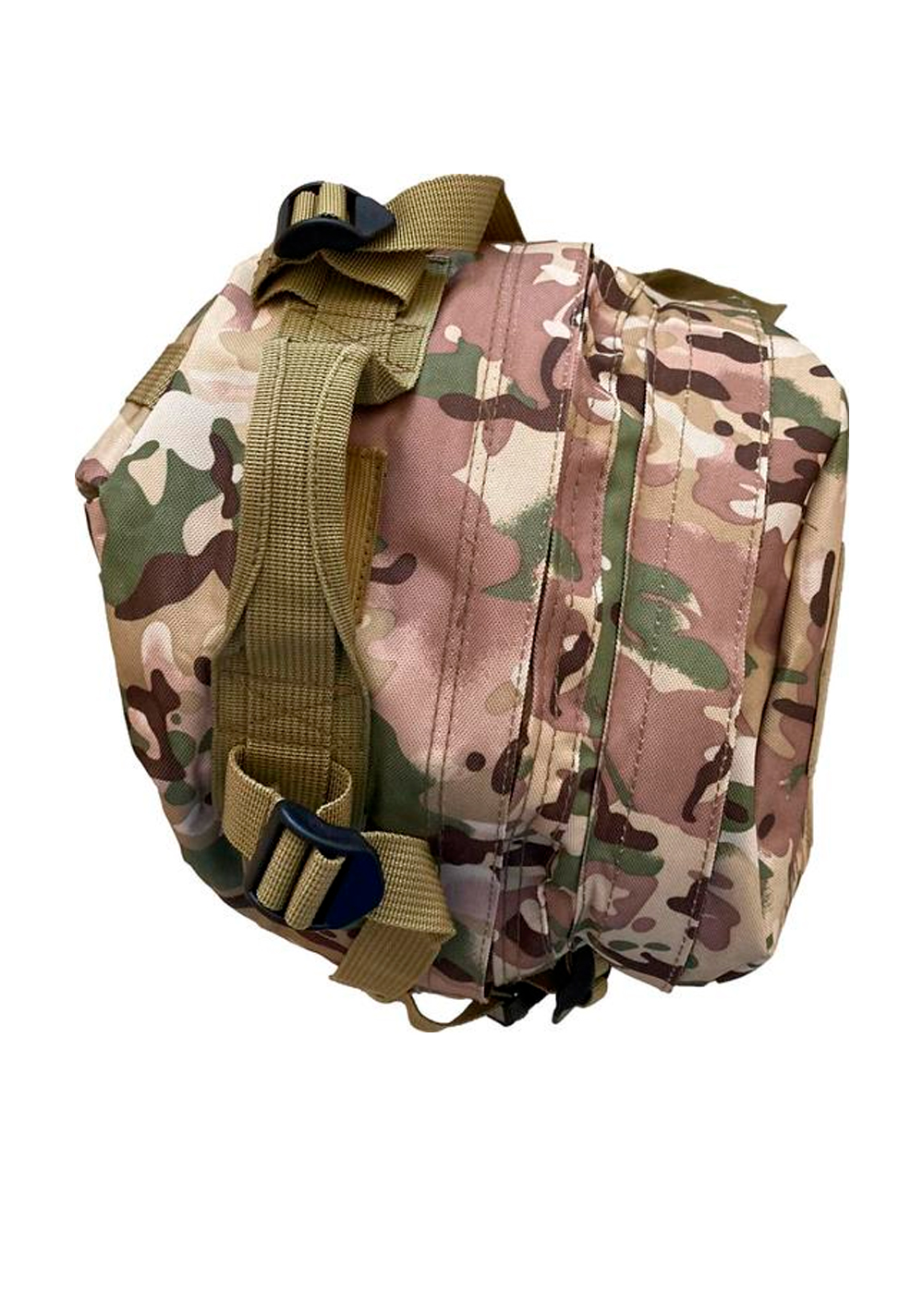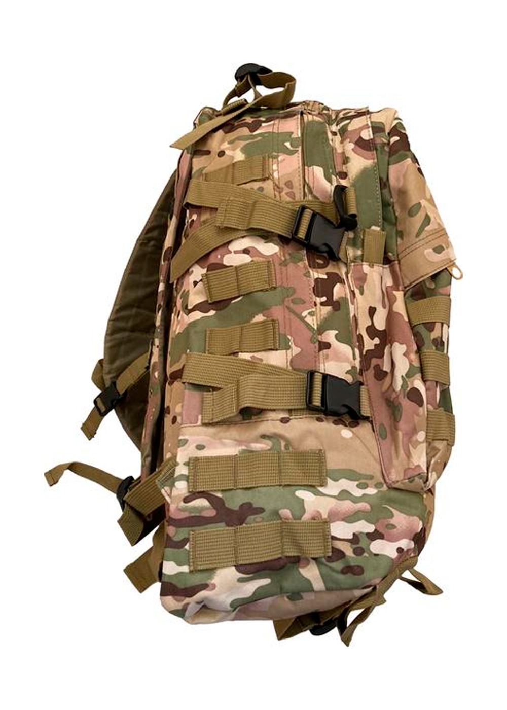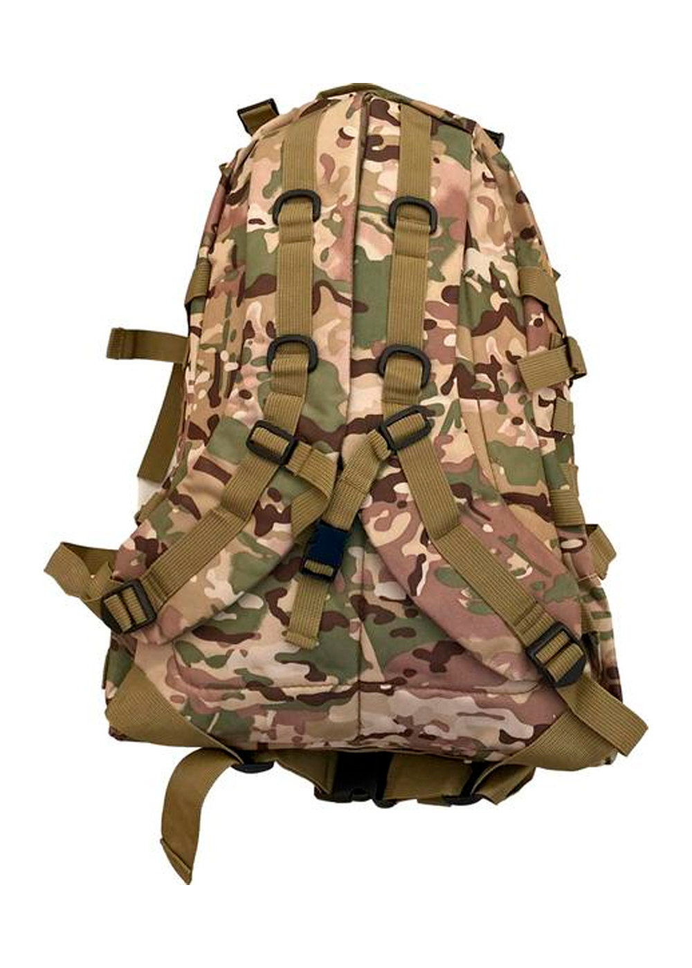 Тактический рюкзак с богатым оснащением: два больших отделения, внутренний карман и внешний плоский. Ленты Molle расположены по бокам и спереди. Регулируемые поясной и нагрудный ремни. Ручка сверху для переноски. Высококачественная водонепроницаемая ткань Оксфорд плотностью 600/900D. D-кольцо для крепления аксессуаров. Регулируемые и нескользящие мягкие лямки. Лента с крючком и петлей и патчи для флажков. Внешние боковые компрессионные ремни.
