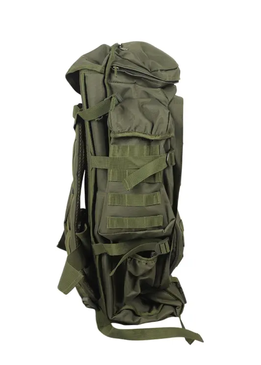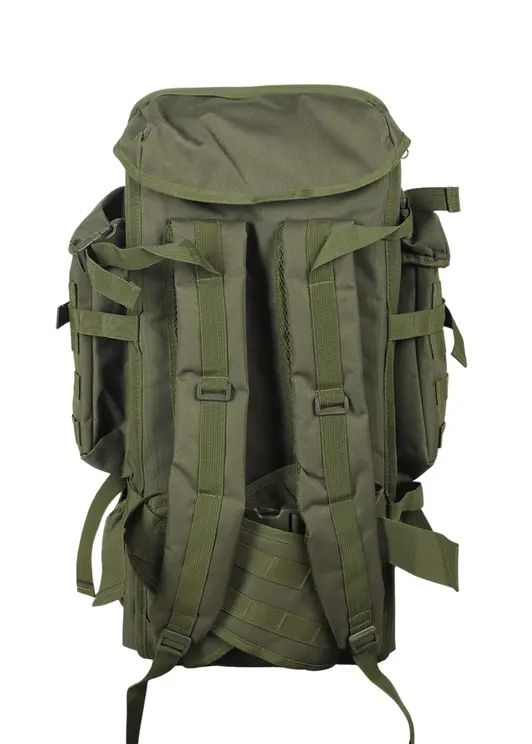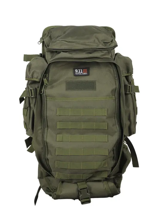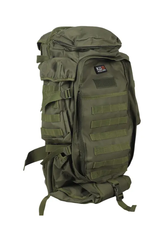 Тактический рюкзак MLT-911 объёмом 75 литров в цвете хаки выполнен из прочного водонепроницаемого нейлона с системой крепления Molle для дополнительных подсумков. Модель оснащена анатомическими плечевыми лямками с вертикальной и горизонтальной регулировкой, а также поясным ремнём для оптимального распределения нагрузки. Рюкзак комплектуется защитным чехлом, имеет множество функциональных карманов, включая боковые карманы для бутылок. Конструкция предусматривает возможность расширения основного отделения, а продуманная организация внутреннего пространства позволяет удобно разместить снаряжение. Вентилируемая спинка обеспечивает комфорт при длительном ношении, а алюминиевые направляющие добавляют жёсткость конструкции. Подходит для туризма, охоты, страйкбола и тактических задач