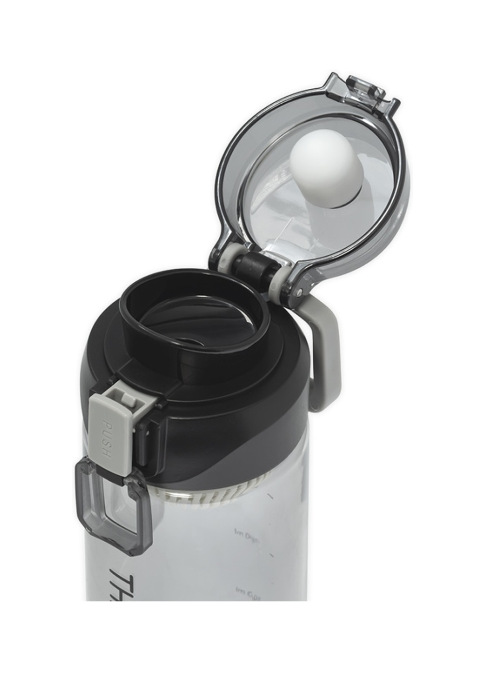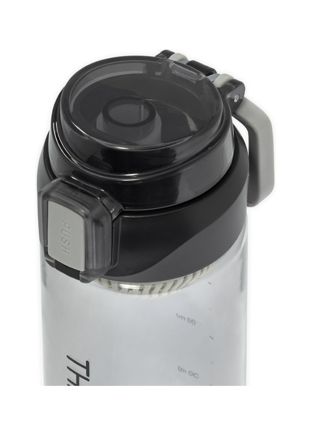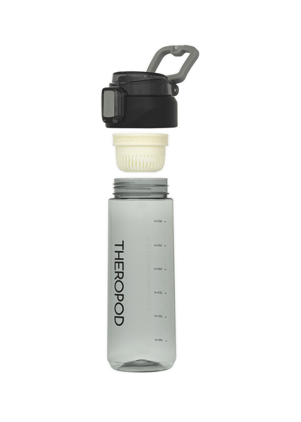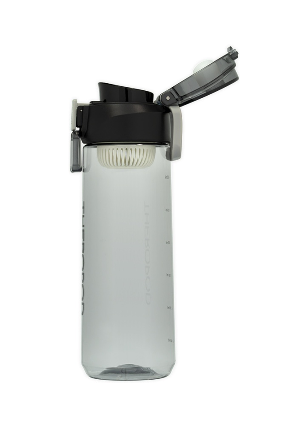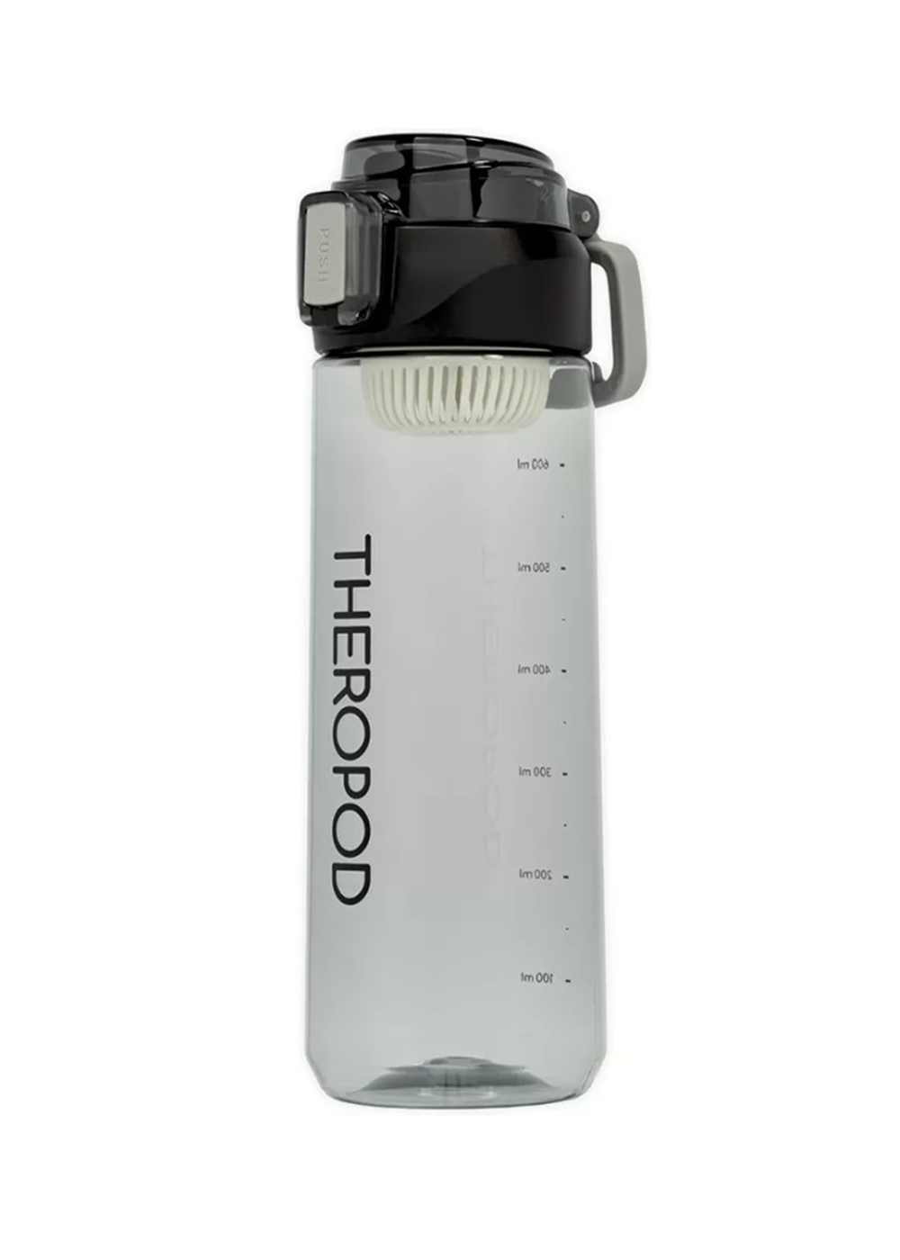 Бутылка для воды THEROPOD TP-2309-730-B объёмом 0,73 литра изготовлена из прочного прозрачного поликарбоната с чёрной крышкой. Модель оснащена удобной откидной крышкой с защитным механизмом от случайного открывания и практичным поильником для комфортного питья на ходу. Узкое отверстие поильника предотвращает расплескивание жидкости, а силиконовый уплотнитель гарантирует герметичность. В комплект входит съёмное ситечко для фильтрации и резиновая петля для переноски. Бутылка оборудована мерной шкалой для контроля объёма жидкости и подходит для размещения в велосипедных держателях и автомобильных подстаканниках. Вес изделия составляет 167 грамм, высота — 237 мм.