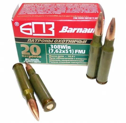 Патрон нарезной БПЗ кал. 7,62х51 FMJ лак. гильза 10,9 гр. (в пачке 20 шт.) (в коробке 500 шт.)