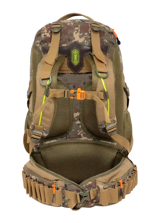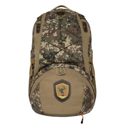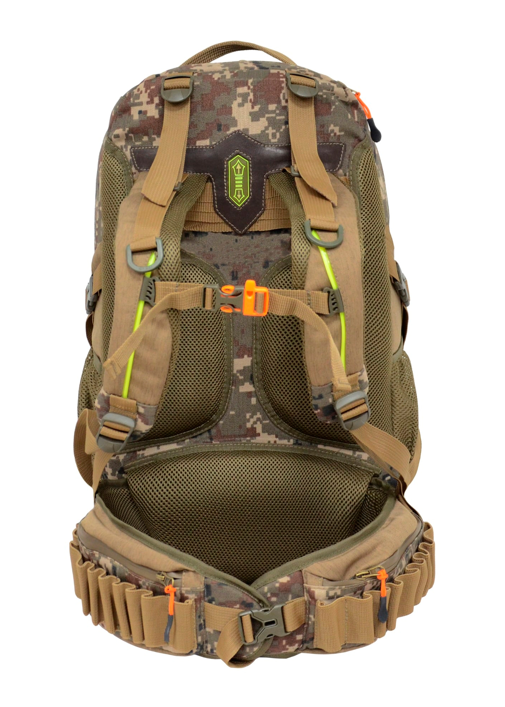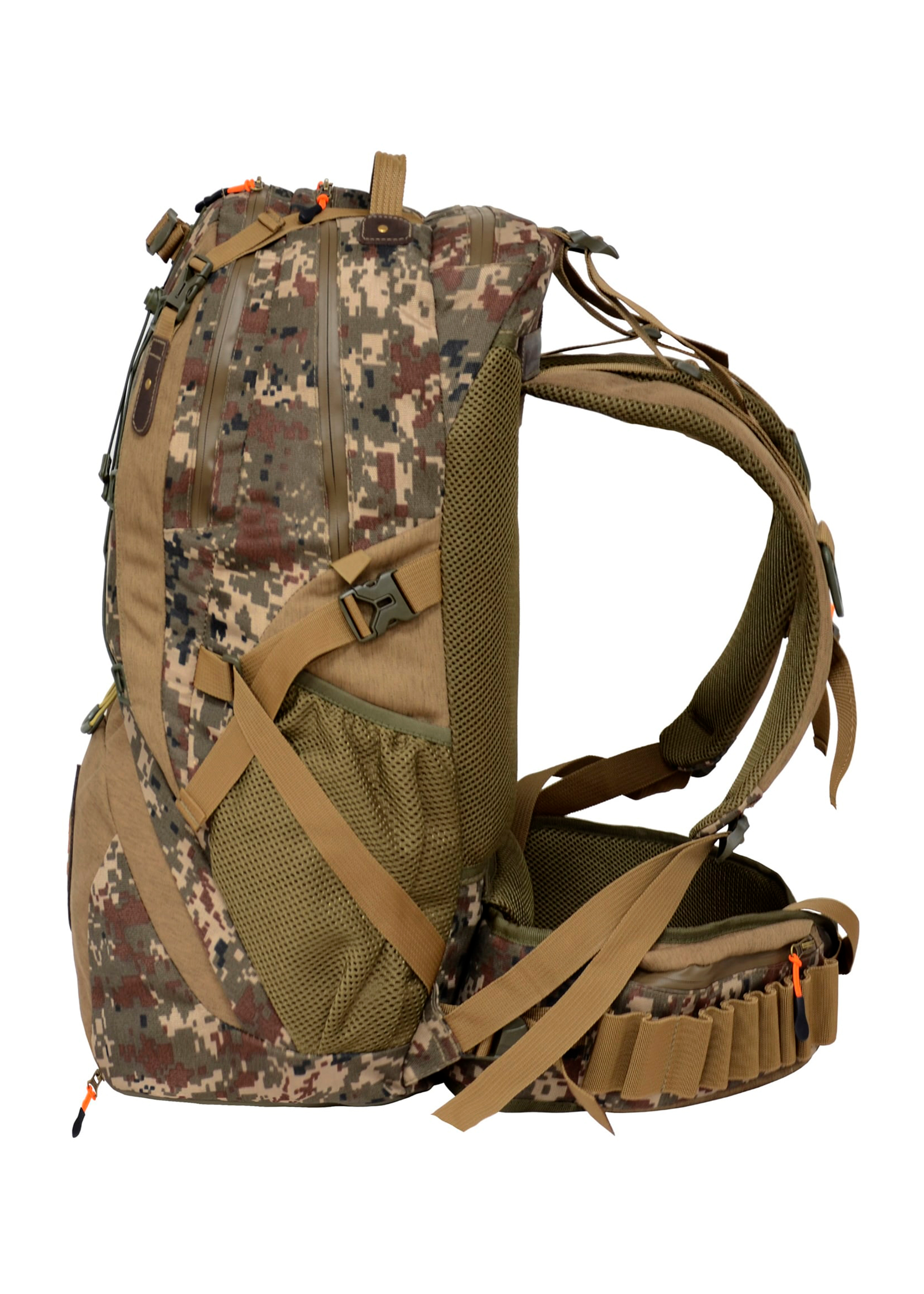 Рюкзак для охоты РО-66. Пояс с дополнительными карманами и патронташем позволяет эффективно перераспределять нагрузку, а конструкция с регулируемой подвесной системой распределяет вес между плечами и бедрами. Основной объем разделяется съемной перегородкой на молнии. Нижний вход. Два малых боковых кармана для переноски длинномерных грузов, плюс фронтальный карман. Водозащищенные молнии. Компрессионные стяжки. Донный карман для влагозащитной накидки. Убирающийся внутрь карман на молнии и фиксатор для оружия. 3 удобных ручки и съемный верхний клапан с карманом. Усиливающие элементы из натуральной кожи.