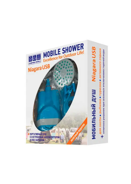 Электрический мобильный душ Niagara от бренда Camping World очень прост в использовании и удобен в перевозке. Его легко можно взять с собой на дачу или пикник. Все, что требуется для его использования - зарядить насосный аккумулятор через USB от машины или бытовой сети. Все остальное для комфортного пользования входит в комплект. Заранее заряженный душ нужно установить на крепёж на устойчивой высоте, включить, сразу поместив насос душа в воду, и затем использовать. Имеет уровень защиты IPX8.