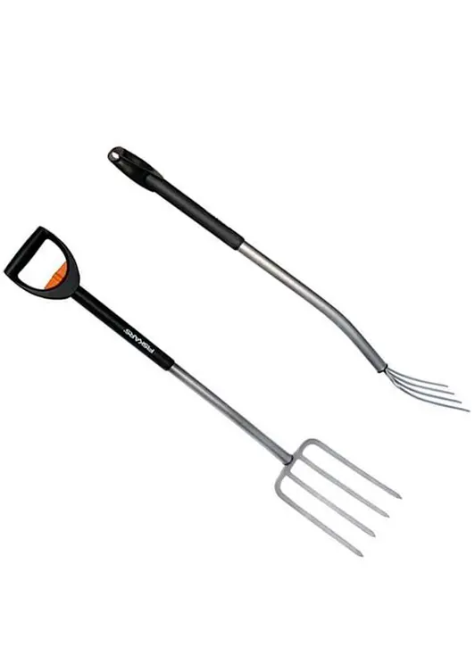 Телескопические садовые вилы применяется для работы с твердой и каменистой почвой. Заточенные зубья вил, выполненные из борсодержащей стали, легко проникают в почву. Ручка, установленная под углом в 13 градусов, и телескопический черенок упрощают работу с инструментом.