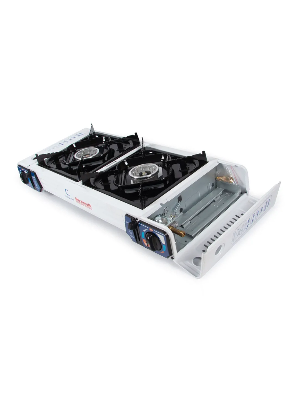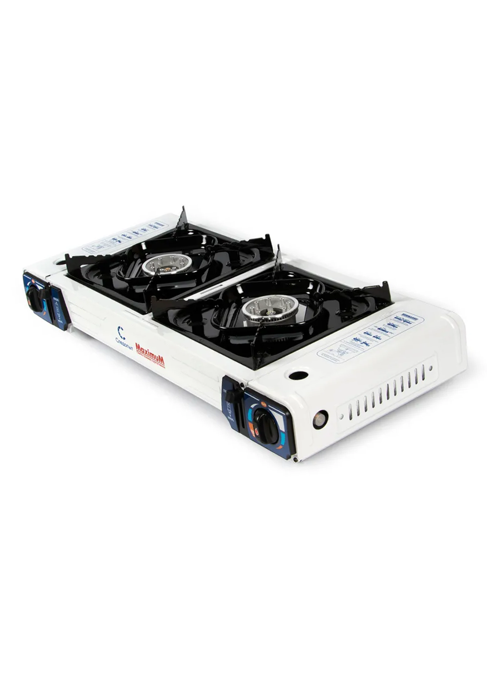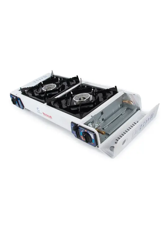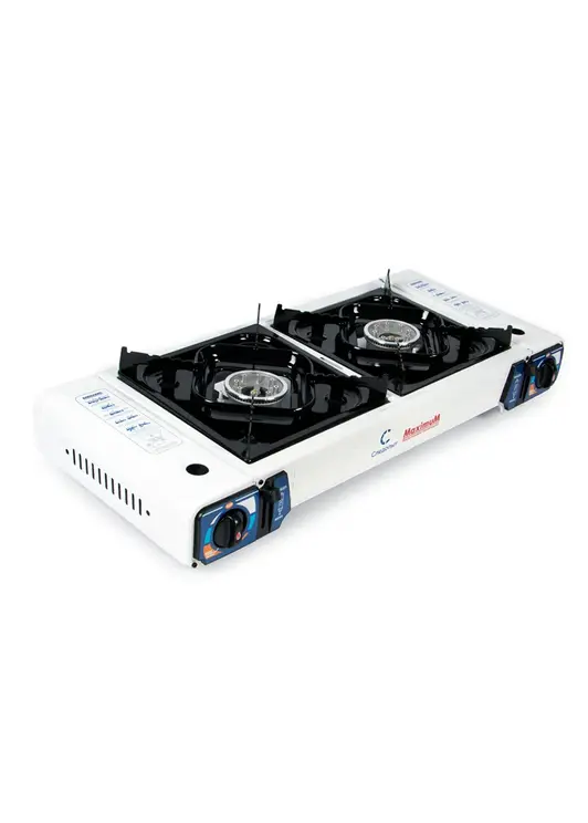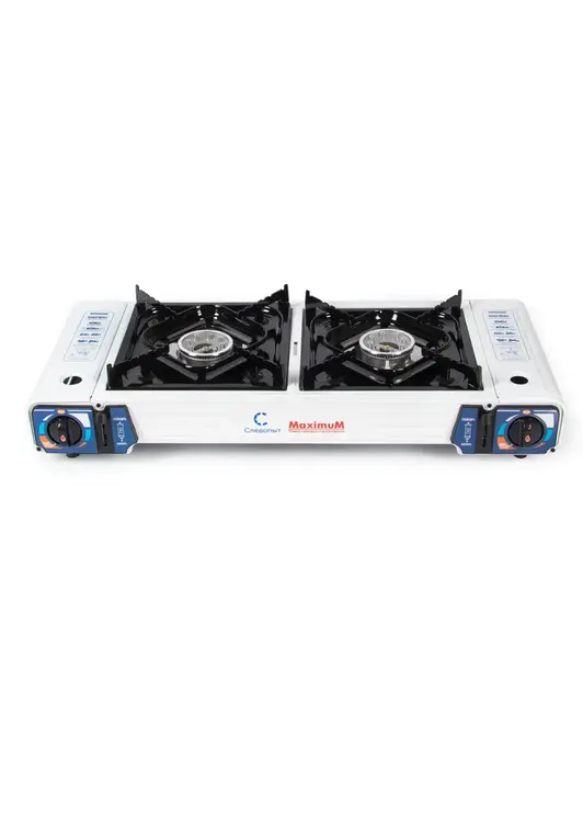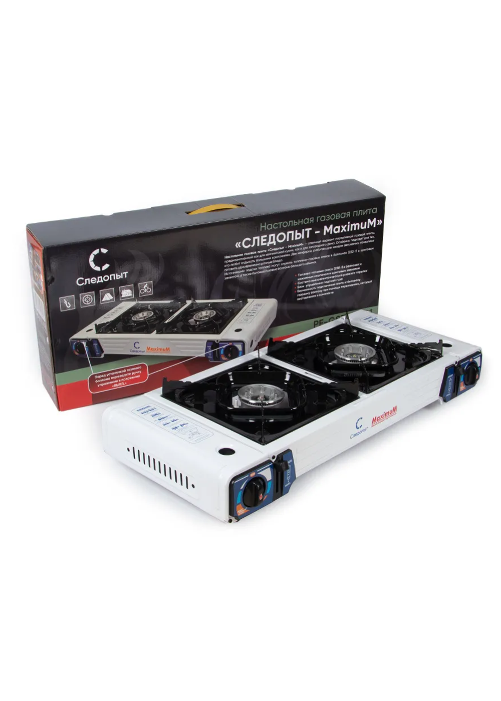 Портативная двухкомфорочная газовая настольная плита "СЛЕДОПЫТ - MaximuM", двойная (с переходником)/3/ - оптимальный вариант для решения проблемы приготовления пищи в походных условиях. Варочная поверхность имеет защиту от задувания пламени ветром, своеобразный воротник, который к тому же, положительно сказывается на увеличении КПД. Данную модель можно использовать и при низких температурах, так как у нее предусмотрен подогрев баллона. Кроме того, эта плита может функционировать от бытового газового баллона.
