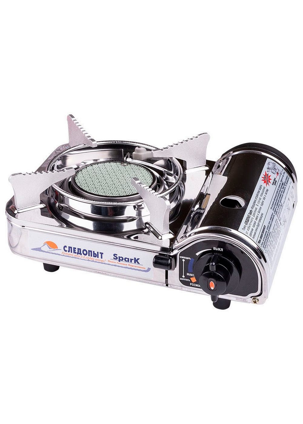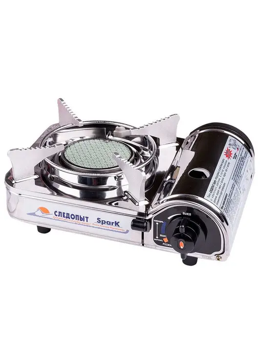 Плита оборудована одной керамической горелкой, системой пъезо-электрического розжига и блоком управления подачей газа. Наличие клапана спуска давления. В случае повышения давления газовой смеси в баллоне - подача газа в систему питания плиты будет прекращена. Корпус плиты и варочная поверхность выполнены из нержавеющей стали. Варочная поверхность оснащена ветрозащитным воротником, который обеспечивает защиту пламени от сильных порывов ветра.