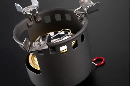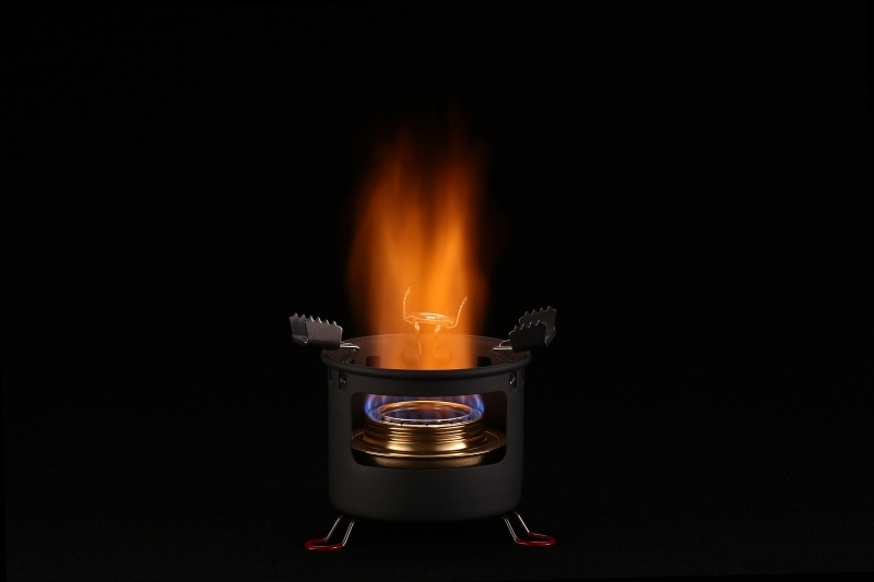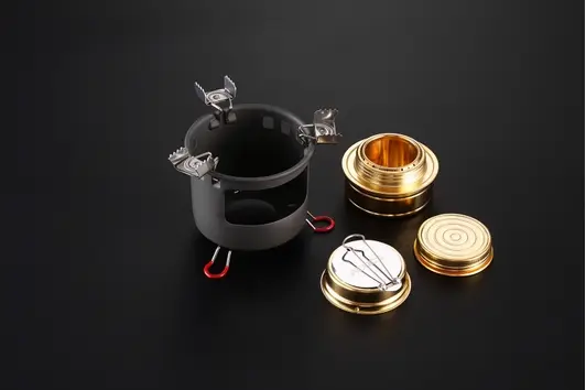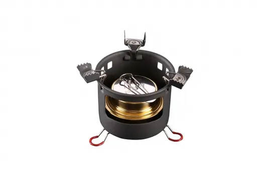 Особенность конструкции — встроенная подставка, которая не только фиксирует горелку, но и выполняет функцию эффективной ветрозащиты, позволяя готовить даже при ветреной погоде. Горелка работает на спирте, отличается простотой заправки и эксплуатации: достаточно заполнить резервуар топливом и можно сразу приступать к приготовлению пищи.