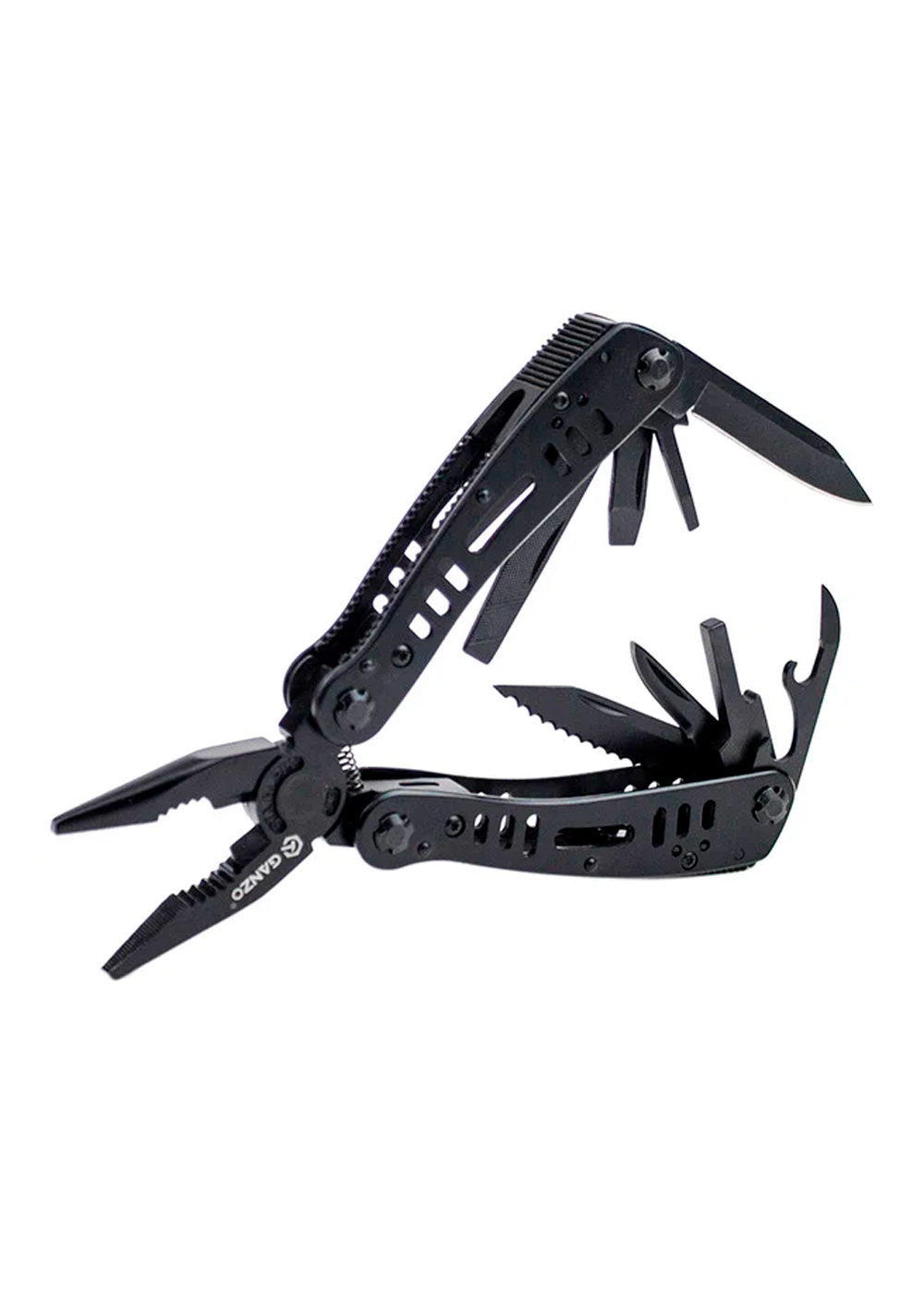 Мультитул Ganzo G103 — это универсальный инструмент, который имеет 22 функции. Он подходит для домашних работ, ремонта велосипеда, туристического снаряжения и других задач. В арсенале мультитула есть плоскогубцы с кусачками, лезвия с прямой и серрейторной заточкой, шило, линейка, открывалка для бутылок, консервный нож, напильник, две плоские отвёртки, крестообразная отвёртка, держатель для бит и набор из 9 бит. Основной инструмент мультитула — полноценные плоскогубцы со встроенными кусачками и ребристым захватом для предметов округлой формы. Они подпружинены, что облегчает работу с инструментом. Инструменты мультитула изготовлены из нержавеющих сталей 440, 2Cr13 и 5Cr14, устойчивы к коррозии и подходят для использования в условиях повышенной влажности. Уход за мультитулом минимален, требуется только протирать его после использования и хранить в сухом месте. Чёрный цвет и матовое покрытие придают инструменту элегантный вид и дополнительную защиту от коррозии.
