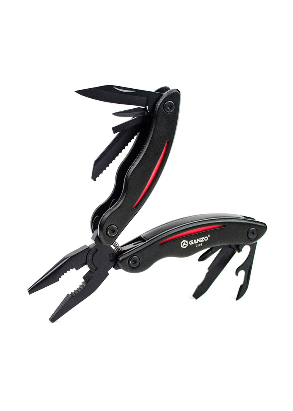 Отличительной особенностью мультитула Ganzo G109 является его привлекательный дизайн. Модель выпускается в двух вариантах: с синей или красной вставкой на черных рукоятках, что придает ему достаточно элегантный вид. В рабочем состоянии рукоятки мультитула выгнуты наружу и имеют эргономичную форму, способствующую удобному удержанию инструмента во время работы. Как и у большинства мультитулов, основным инструментом Ganzo G109 являются полноценные подпружиненные пассатижи (плоскогубцы). Наличие пружины повышает комфортность использования мультиинструмента.