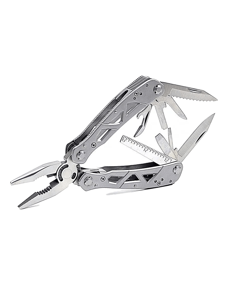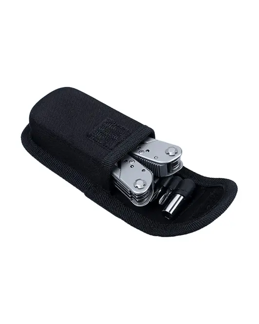 В набор входит два ножа: с прямой и серрейторной режущей кромкой, шило, линейка, открывалки для банок и бутылок, одна крестовидная и две плоских отвертки. Помимо того, в набор включены девять сменных насадок для отвертки и магнитный переходник для них. Все насадки хранятся в отдельных гнездах общего органайзера. Их можно вместе с мультитулом сложить в чехол из нейлона, который также продается в комплекте с мультитулом.