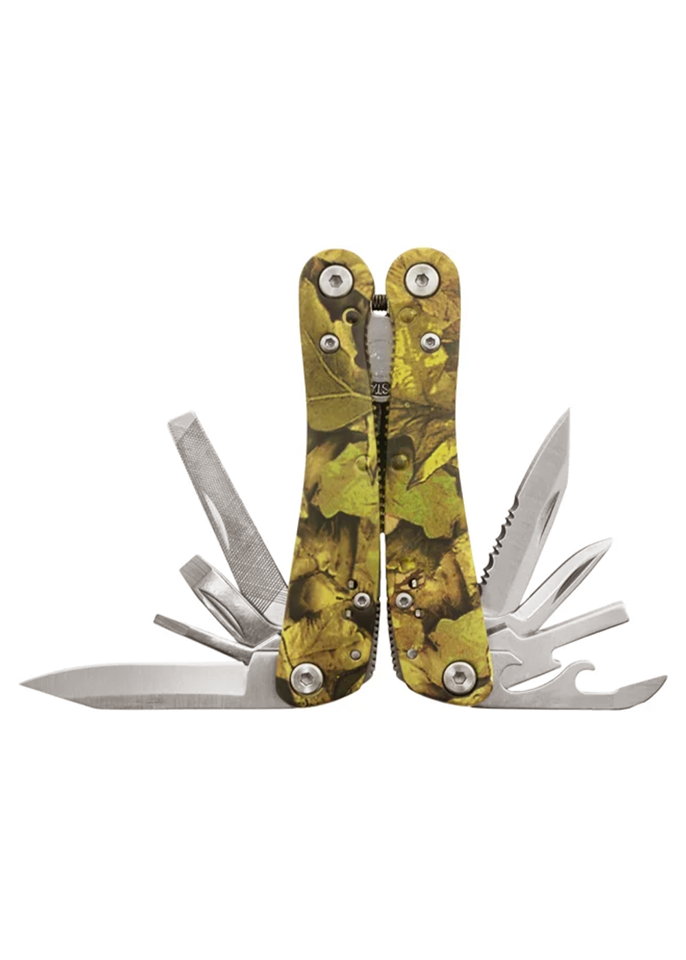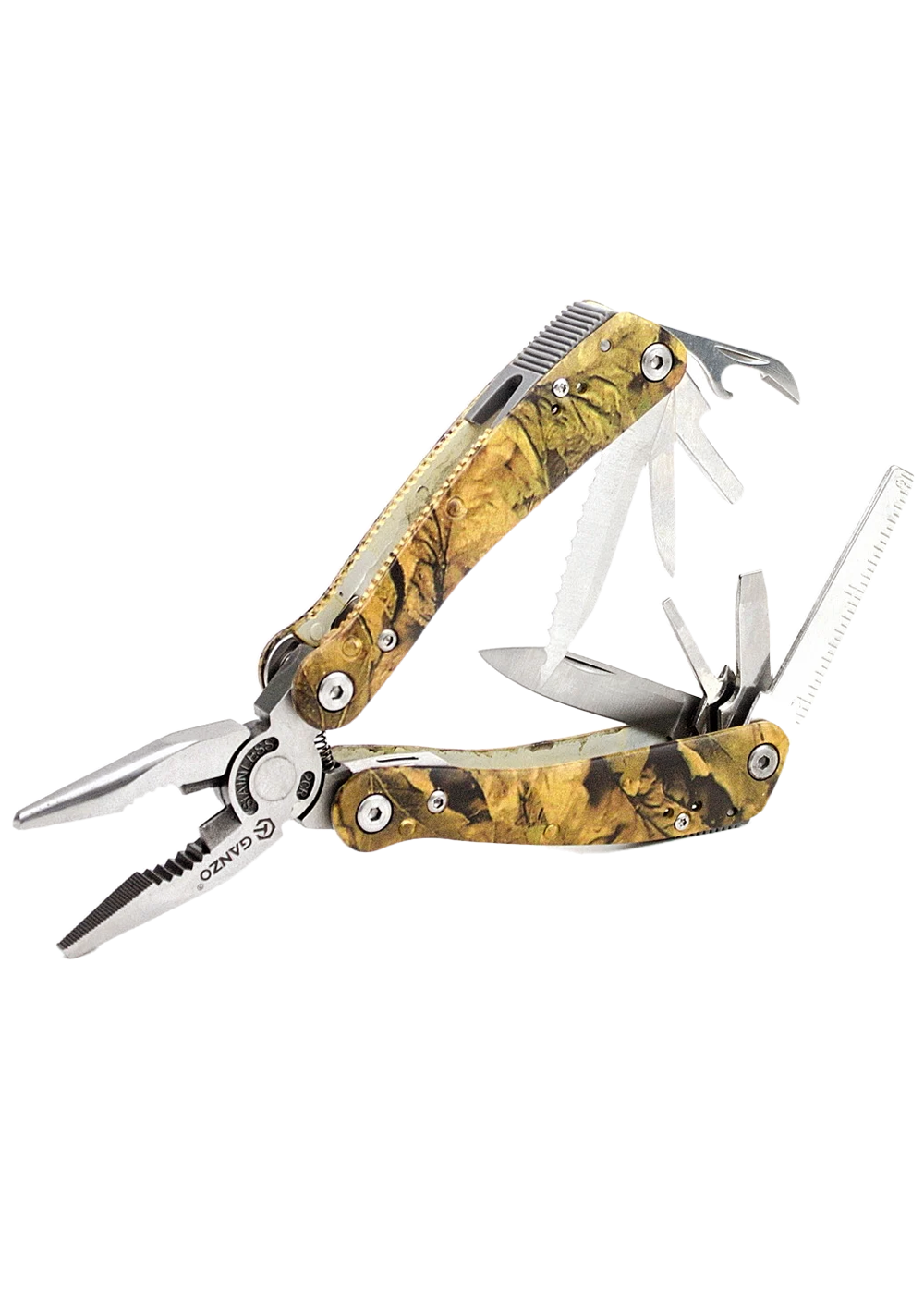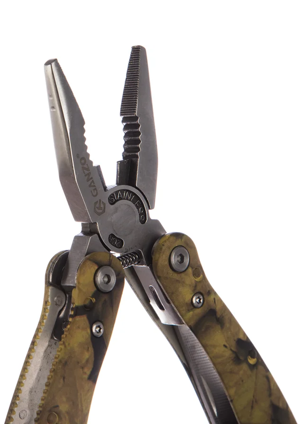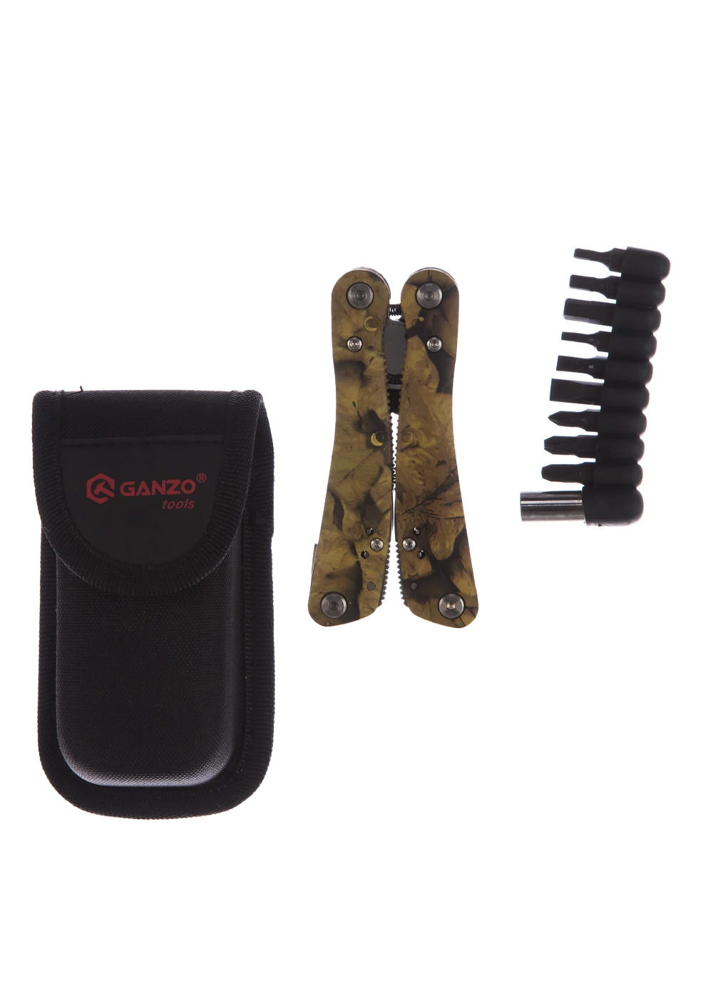 Прекрасный мультитул G2016-P от компании Ganzo. Дизайн модели рассчитан на охотников, рыболовов и любителей вещей в стиле «милитари». На ручках мультитула G2016-P закреплены пластиковые накладки, имеющие камуфлирующую окраску. В комплекте инструментов находятся: подпружиненные плоскогубцы с кусачками, два лезвия, одно из которых имеет серрейторную заточку, две шлицевых отвертки разного размера, напильник, линейка, удлинитель адаптера для бит, нож для консервов и открывалка для бутылок. Все инструменты выполнены из нержавеющей стали 440С. Также в комплект мультитула G2016-P входит кассета с адаптером и битами их высокоуглеродистой стали (3 шлицевых отвертки, 3 крестовых отвертки, 3 шестигранных ключа). Модель мультитула G2016-P станет вашим верным помощником в городе и на активном отдыхе. Эта модель будет отличным вариантом для походов, охоты, незаменимым инструментом в Вашей машине или квартире. Благодаря крепкому сплаву обладает большим ресурсом эксплуатации и надежности.