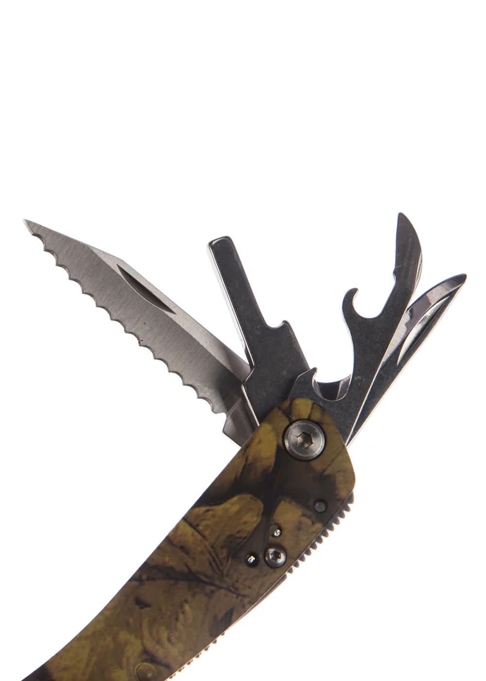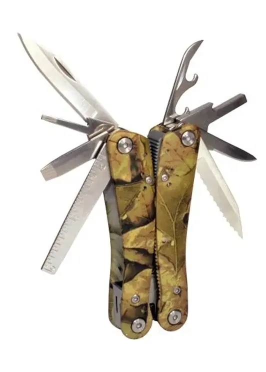 - Функции: плоскогубцы,кусачки,средняя отвертка плоская,маленькая отвертка плоская,нож,серрейтор,линейка,консервный нож,открывалка для бутылок,напильник,шило,держитель бит,10 сменных насадок