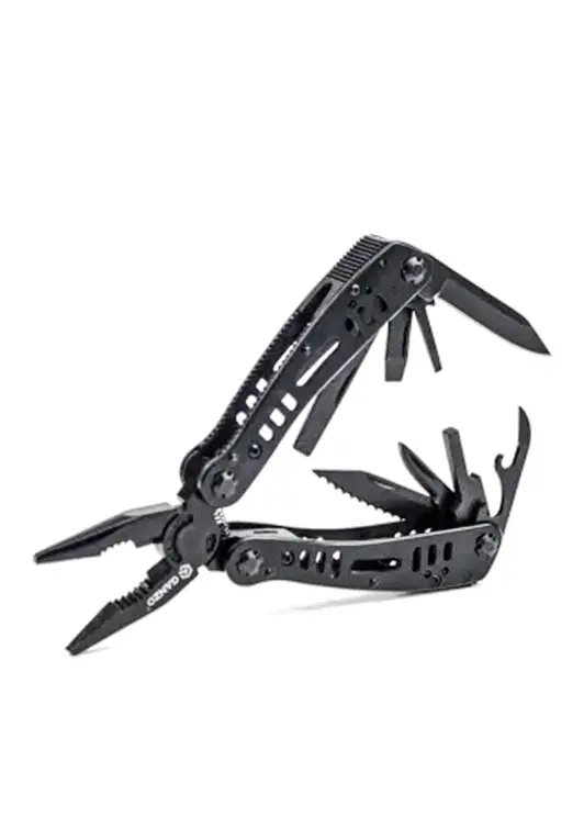 Мультитул Ganzo G103 — универсальный инструмент с 22 функциями в компактном корпусе из нержавеющей стали 440C с защитным черным покрытием. Оснащён полноценными плоскогубцами с кусачками и ребристым захватом, включает два клинка (гладкий и серрейторный), отвертки, шило, открывалку для бутылок, линейку с напильником. В комплект входят держатель для бит и набор из 8 сменных насадок с переходником, тканевый чехол. Размеры в сложенном виде — 105×193 мм, вес — 248 г, подходит для ремонта велосипеда, туристического снаряжения, бытового использования.