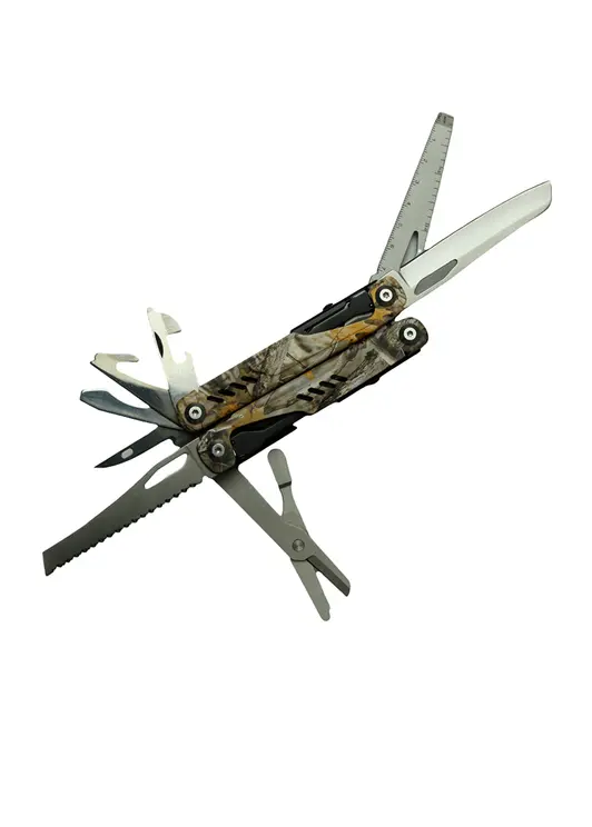 Многофункциональный инструмент с 15 различными функциями для повседневного использования и активного отдыха. Компактный размер, прочные материалы, многофункциональность, удобная рукоять, надежные механизмы фиксации, практичность в использовании. Список инструментов: Плоскогубцы, Нож, Ножницы, Кусачки, Плоская отвертка (большая), Плоская отвертка (малая), Крестообразная отвертка, Открывалка для бутылок, Консервный нож, Крюк, Резак, Шило, Держатель для бит, Пила, Линейка.