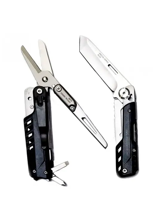 Компактный мультитул PMX-PRO AUS-8, производство компании PMX. Изделие совмещает в себе пять предметов: универсальный нож (длина клинка 75 мм), стеклобой, ножницы и две отвертки (крестовая и шлицевая). Все предметы в одном корпусе, для работы открывается нужный инструмент и фиксируется кнопкой, таким образом другие предметы не мешают работе с ним.