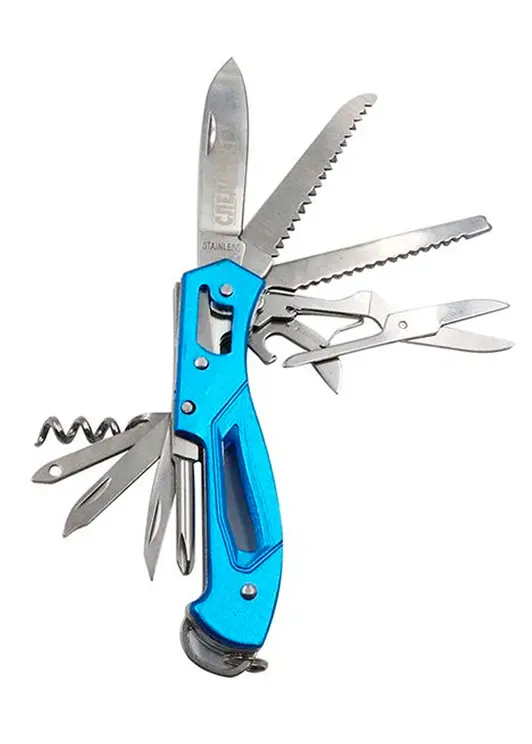 Мультитул “Следопыт” с 10 предметами в коробке - отличный выбор для туризма, рыбалки и охоты. Он включает плоскогубцы, напильник, пилу, шило, отвертку и другие инструменты. Мультитул изготовлен из прочной стали и имеет прорезиненные ручки для удобного хвата. В комплекте идет коробка для хранения и переноски мультитула.