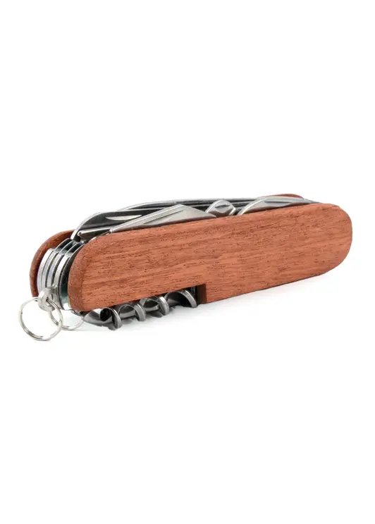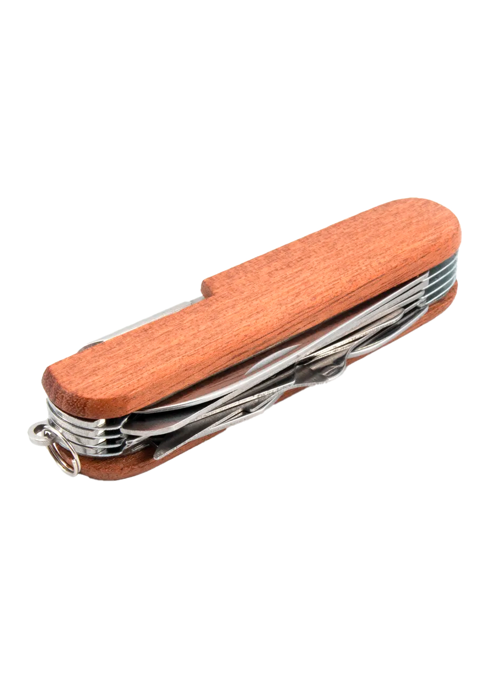 Мультитул «Следопыт – с деревянной ручкой» – набор из 11 предметов профильного или повседневного инструмента, заключенный в одном компактном корпусе. Изготовлен из комплектующих высочайшего качества, которые выполнены из особо прочной нержавеющей инструментальной стали. Режущие кромки ножей остро заточены, а эргономичная рукоятка обеспечивает удобство и безопасность использования изделия. В комплект мультитула входят: Нож , Игла , Шило , Штопор , Отвертка , Ножницы , Напильник , Открывалка , Двойная пила , Одинарная пила , Консервный нож.