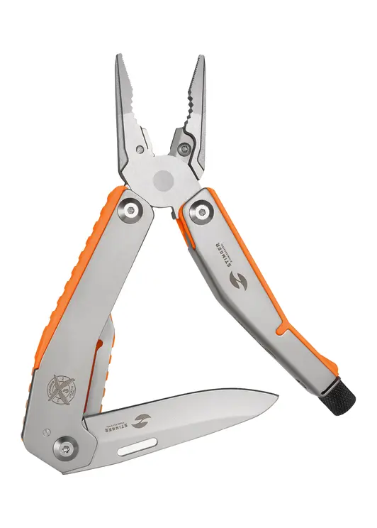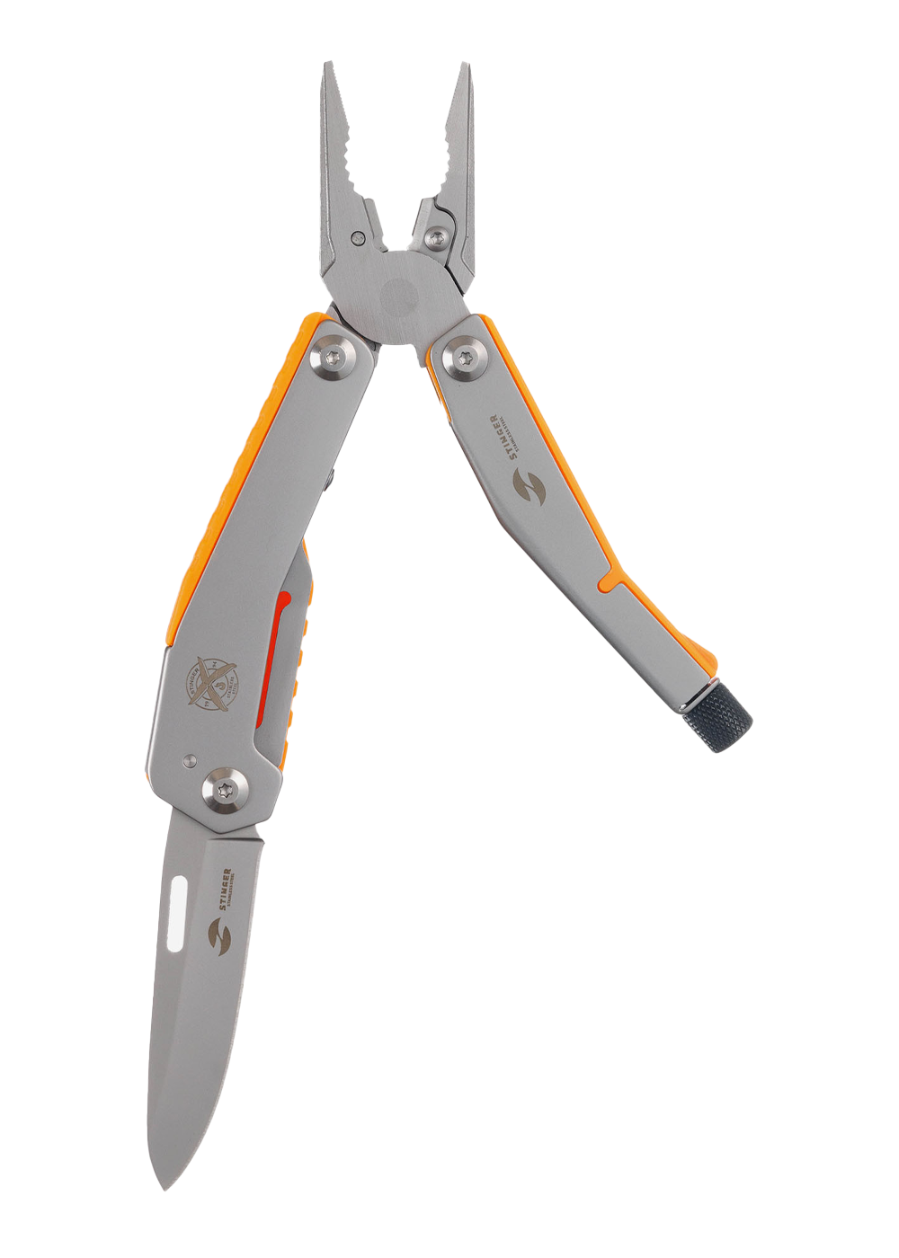 Многофункциональный инструмент Stinger с набором из 8 функций: острогубцы, плоскогубцы, кусачки, лезвие с фиксатором клинка Liner Lock, адаптер для бит, плоская отвертка, крестовая отвертка, клип. Материал лезвия и инструментов: нержавеющая сталь 440A, твердость 54–58 HRC. Материал рукояти: нержавеющая сталь 440A, твердость 54–58 HRC с накладками из АБС-пластика. Цвет накладок рукояти: оранжевый. Накладки рукояти мультитула не подлежат замене. Комплектация: набор из 2 бит, нейлоновый чехол. Упакован в картонную коробку.