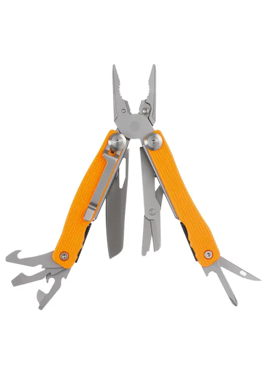 Многофункциональный инструмент Stinger с набором из 14 функций: острогубцы, плоскогубцы, кусачки, лезвие с фиксатором клинка Liner Lock, ножницы, многоцелевой резак (стропорез, резак для автомобильного ремня), открывалка для бутылок с плоской отверткой, консервный нож с плоской отверткой мини, крестовая отвертка, шило-кернер с иглой, клип. Материал лезвия и инструментов: нержавеющая сталь 440A, твердость 54–58 HRC. Материал рукояти: нержавеющая сталь 440A, твердость 54–58 HRC с накладками из АБС-пластика. Цвет накладок рукояти: оранжевый. Накладки рукояти мультитула не подлежат замене. Комплектация: адаптер для бит, набор из 11 бит, нейлоновый чехол. Упаковка: картонная коробка.