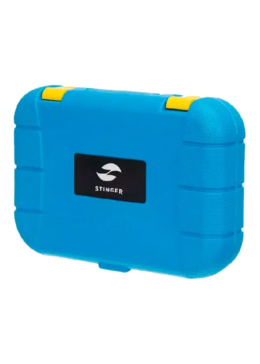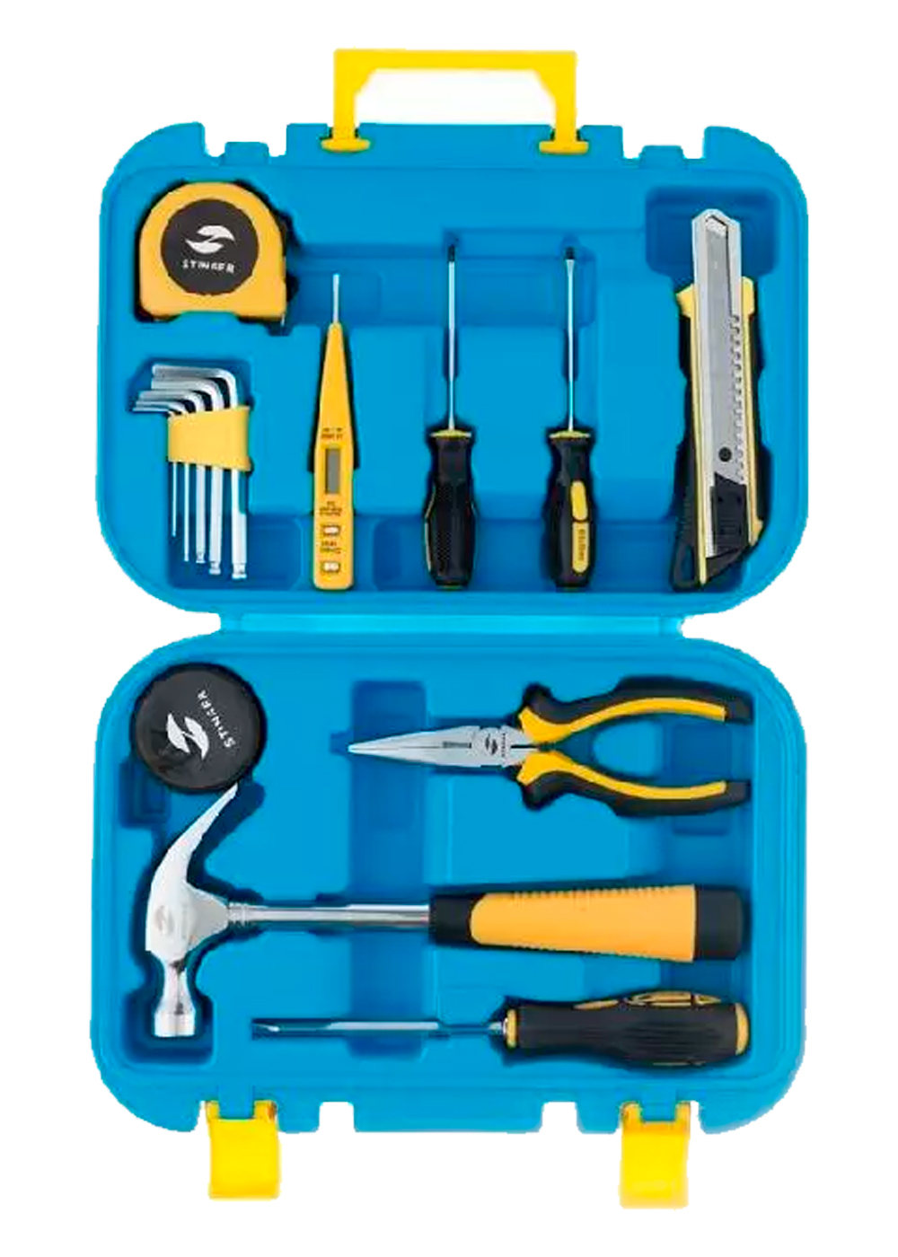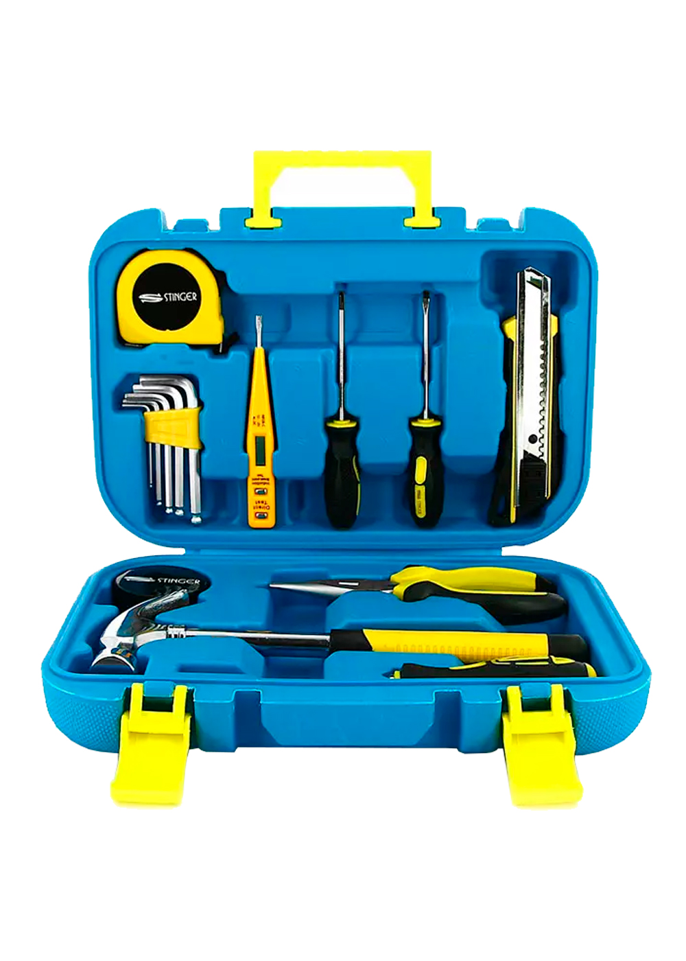 Набор инструментов Stinger состоит из 15 предметов, упакованных в пластиковый кейс синего цвета размером 290x205x75 мм. Инструменты изготовлены из высококачественной углеродистой стали с хромированным покрытием и эргономичными пластиковыми ручками. В комплект входят: нож канцелярский, отвёртки шлицевые и крестовые, ключи шестигранные, молоток, отвёртка индикаторная, рулетка измерительная, лента изоляционная, плоскогубцы.